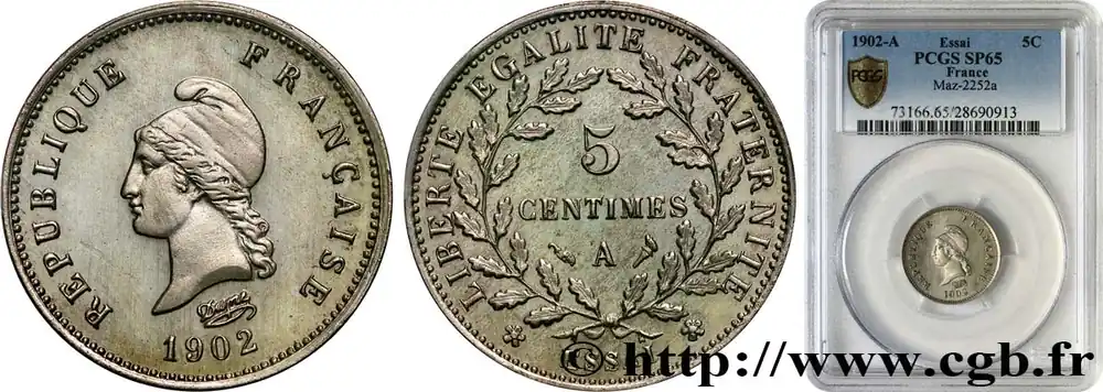 Certifié Essai-Piéfort de 5 centimes d’après Dupré, Maillechort, flan rond 1902 Paris GEM.11 EP fmd_626307 Modernes