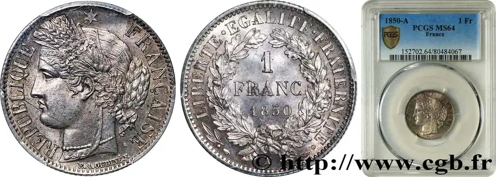 1 franc Cérès, IIe République, différent oreille basse 1850 Paris F.211/5 fmd_612154 Modernes Garantie Incluse