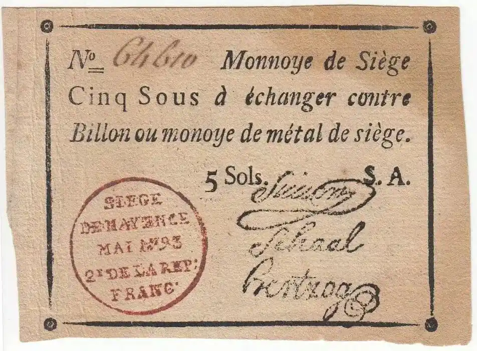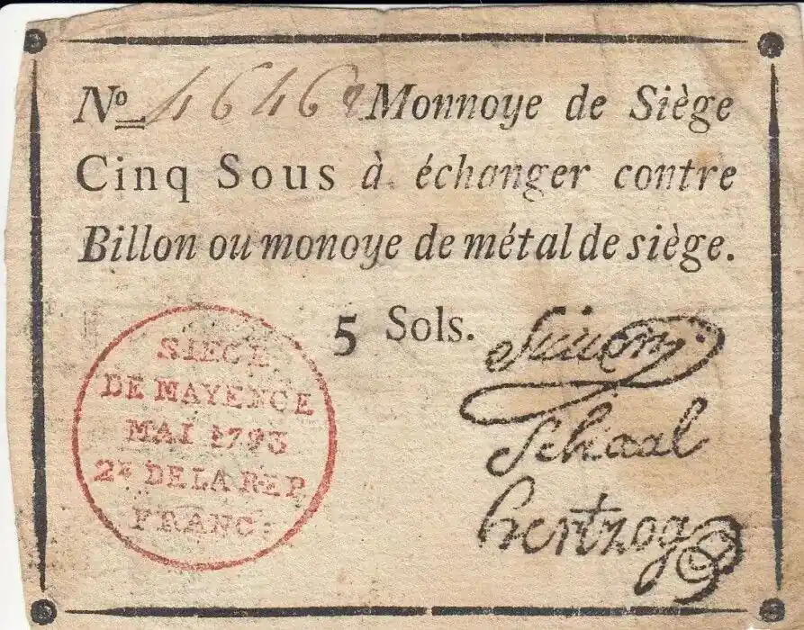 Offre Limitée Billet Mayence 5 Sols Noir – Tampon rouge – Série A Mai 1793