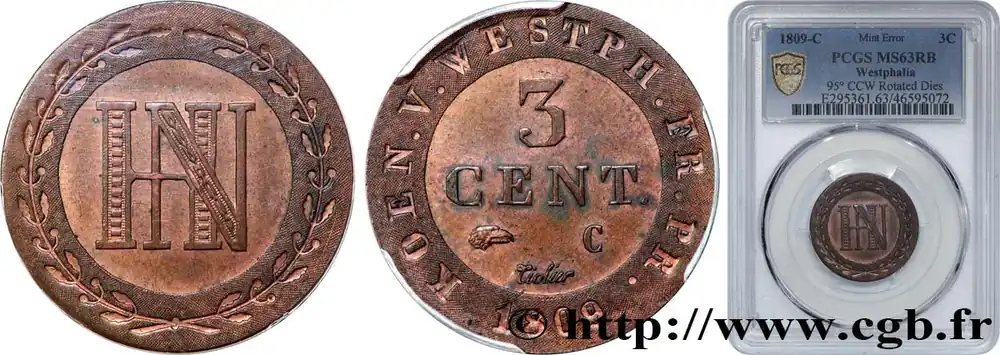ALLEMAGNE – ROYAUME DE WESTPHALIE – JÉRÔME NAPOLÉON 3 Cent. monogramme de Jérôme Napoléon, désaxée à 95 degré 1809 Cassel fwo_824161 Monde Top Qualité