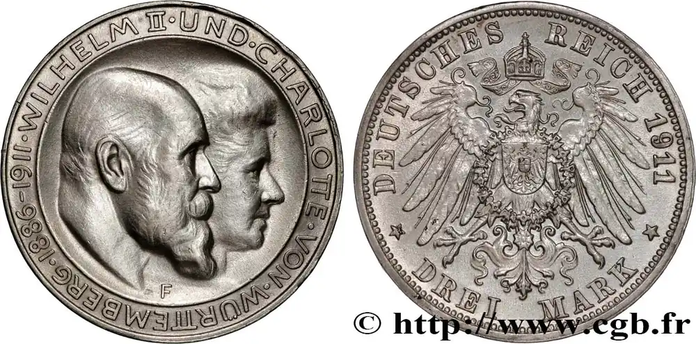 ALLEMAGNE – ROYAUME DE WURTTEMBERG – GUILLAUME II 3 Mark, Willem II et Charlotte 1911 fwo_895554 Monde Petit Prix
