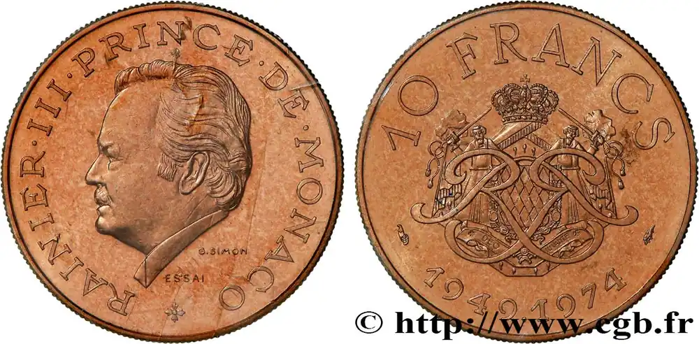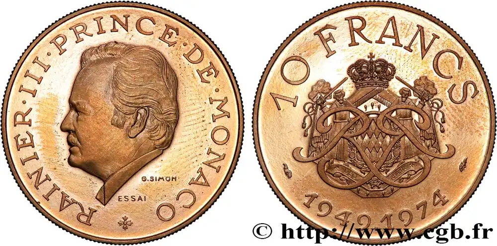MONACO Essai de 10 Francs Rainier III 25e anniversaire de règne 1974 Paris fwo_894692 Monde Prix Bas