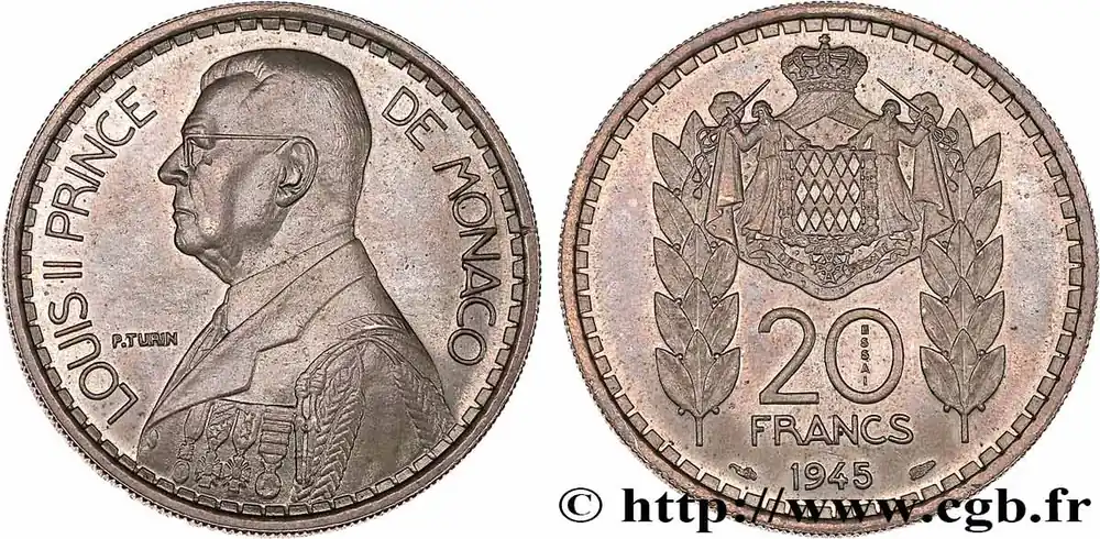 MONACO Essai de 20 Francs Turin Louis II 1945 Paris fwo_765560 Monde Jusqu’à Épuisement Des Stocks