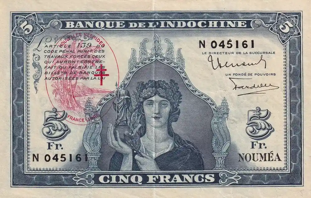 Exclusif Billet Nouvelles Hébrides 5 Francs – Minerve surchargé France Libre – ND (1945) – P.5