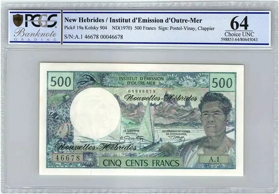Fait Main Billet Nouvelles Hébrides 500 Francs Polynésien – Pirogue – 1970 alph A.1 – PCGS UNC 64