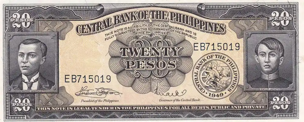 Pas Cher Billet Philippines 20 Piso – A. Bonifacio & E. Jacinto – ND (1949) – Série EB – P.137e