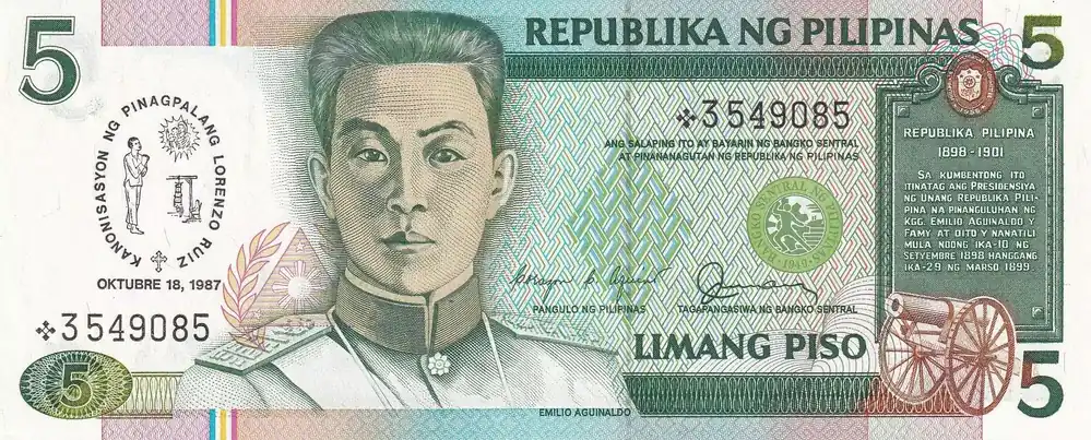 Certifié Billet Philippines 5 Piso – Emilio Aguinaldo – 1987 – * Remplacement – P.168br