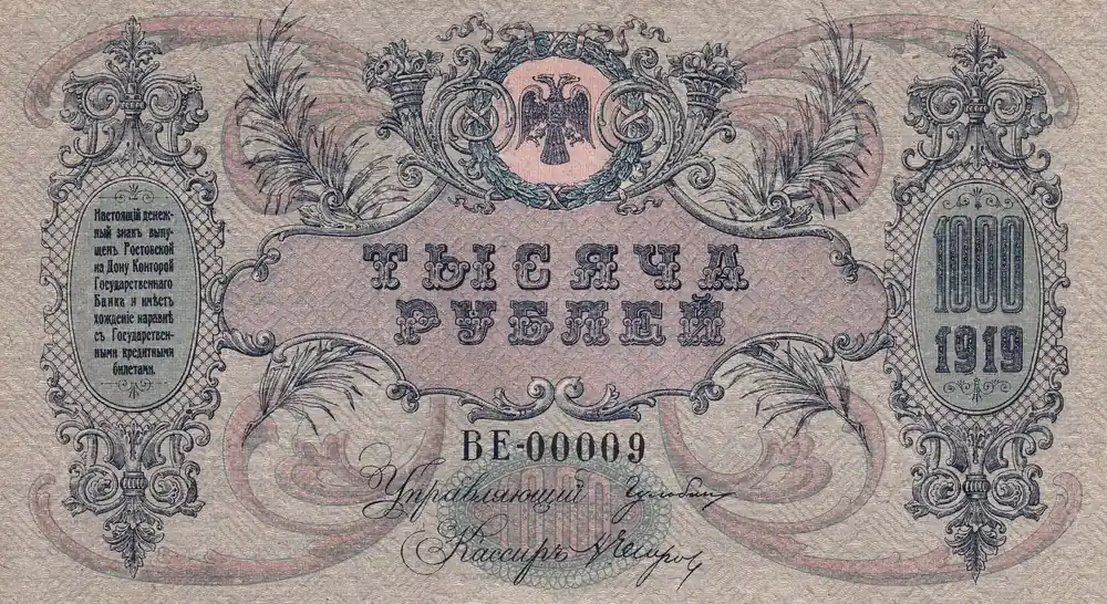 Gros Lot Billet Russie 1000 Roubles – Aigle à 2 têtes – Femme et sceptre – 1919 – Petit numéro – P.S418b