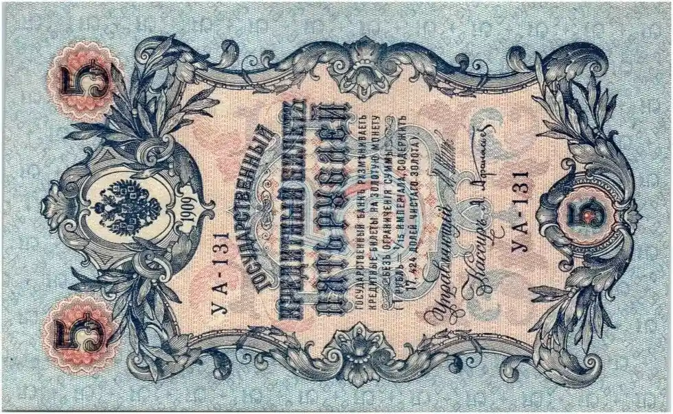 Dernier Modèle Billet Russie 5 Roubles Aigle impérial – 1909 – Sign. Shipov (1912-1917)