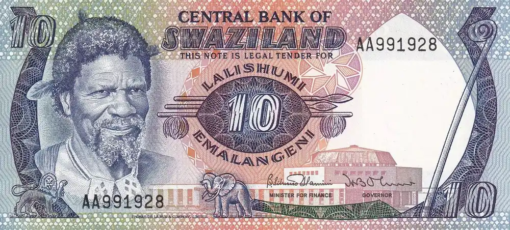 Billet Swaziland 10 Emalangeni – Roi Sobuzha II – Mine Asbestos – ND (1985) – Série AA – P.10c Soldes
