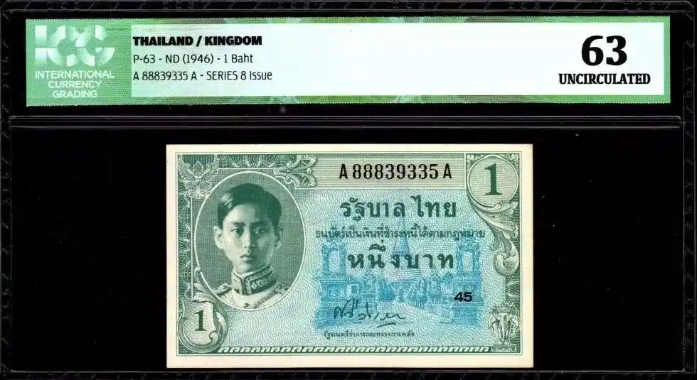 Billet Thaïlande 1 Baht Roi Rama VIII – Ornements – ICG UNC63 Certifié