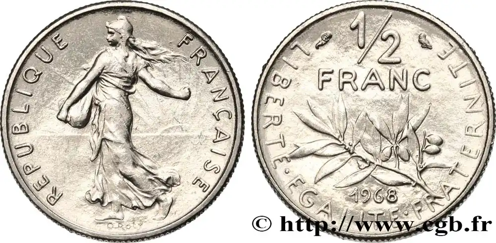 Type : 1/2 franc SemeuseDate : 1984Nom de l’atelier/ville : PessacQuantité frappée : 80001436Métal : nickelDiamètre : 19,5 mmAxe des coins : 6 h.Poids : 4,50 g.Tranche : striéeRéférence ouvrage :Classement FRANC 2023 / FRANC 2023 classificationF.198/23AversTitulature avers : REPUBLIQUEFRANÇAISE.Description avers : La République à gauche, sous les traits d’une semeuse drapée et coiffée d’un bonnet phrygien, aux cheveux longs, marchant et semant à contre-vent ; en arrière-plan, derrière la semeuse à droite, un soleil levant ; au-dessous, en creux O. ROTY.ReversTitulature revers : LIBERTE. EGALITE. FRATERNITE..Description revers : 1/2 / FRANC encadré des différents, en deux lignes au-dessus d’une branche d’olivier ; au-dessous, 1984.CommentaireExemplaire sous plastique provenant d’une série FDC.HistoriqueCINQUIÈME RÉPUBLIQUE(depuis le 08/01/1959) La Cinquième République, dont la constitution a été approuvée par référendum le 28 septembre 1958 par plus de 79 % des Français, ne débute officiellement qu’avec l’installation du général de Gaulle comme président le 8 janvier 1959. La constitution est modifiée le 28 octobre 1962 par référendum où une majorité de 62 % des voix approuve l’élection du président de la République au suffrage universel direct. Les différents présidents de la Ve République sont Charles de Gaulle (8/01/1959 – 27/04/1969, retrait et Alain Poher devient président par intérim), Georges Pompidou (15/06/1969 – 2/04/1974, décédé, Alain Poher devient président par intérim), Valéry Giscard d’Estaing (19/05/1974 – 21/05/1981), François Mitterrand (21/05/1981 – 7/05/1995), Jacques Chirac (7/05/1995 – 16/05/2007) , Nicolas Sarkozy (16/05/2007 – 15/05/2012), François Hollande (15/05/2012 – 14/05/2017) et Emmanuel Macron (14/05/2017 – ).