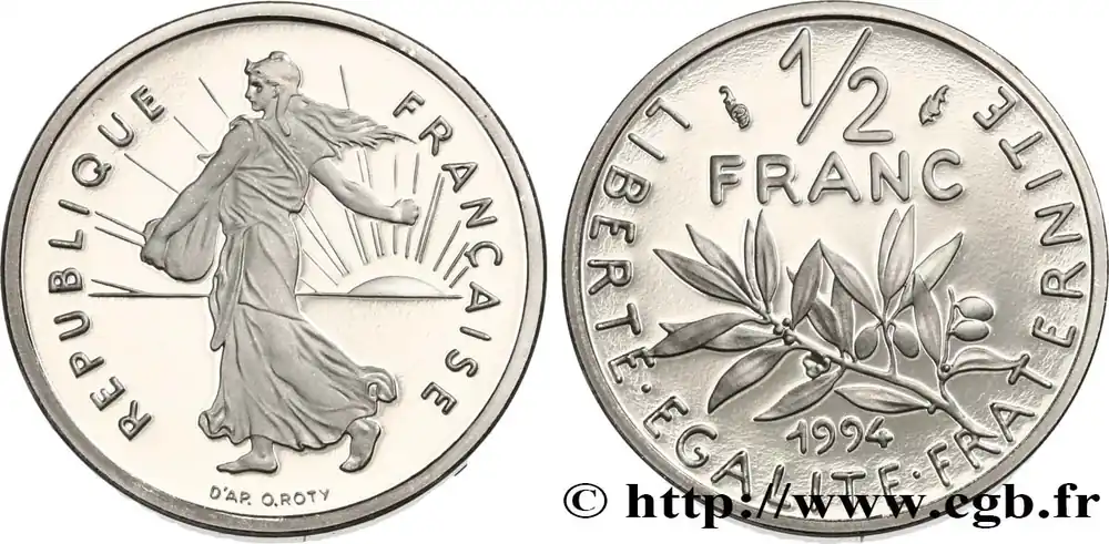 Type : 1/2 franc Semeuse, Belle ÉpreuveDate : 1992Nom de l’atelier/ville : PessacQuantité frappée : 4938Métal : nickelDiamètre : 19,5 mmAxe des coins : 6 h.Poids : 4,50 g.Tranche : lisseDegré de rareté : R1Référence ouvrage :Classement FRANC 2023 / FRANC 2023 classificationF.198/32 var.AversTitulature avers : REPUBLIQUEFRANÇAISE.Description avers : La République à gauche, sous les traits d’une semeuse drapée et coiffée d’un bonnet phrygien, aux cheveux longs, marchant et semant à contre-vent ; en arrière-plan, derrière la semeuse à droite, un soleil levant ; au-dessous, en creux O. ROTY.ReversTitulature revers : LIBERTE. EGALITE. FRATERNITE..Description revers : 1/2 / FRANC encadré des différents, en deux lignes au-dessus d’une branche d’olivier ; au-dessous, le millésime.CommentaireExemplaire sous capsule issu d’une série Belle Épreuve..HistoriqueCINQUIÈME RÉPUBLIQUE(depuis le 08/01/1959) La Cinquième République, dont la constitution a été approuvée par référendum le 28 septembre 1958 par plus de 79 % des Français, ne débute officiellement qu’avec l’installation du général de Gaulle comme président le 8 janvier 1959. La constitution est modifiée le 28 octobre 1962 par référendum où une majorité de 62 % des voix approuve l’élection du président de la République au suffrage universel direct. Les différents présidents de la Ve République sont Charles de Gaulle (8/01/1959 – 27/04/1969, retrait et Alain Poher devient président par intérim), Georges Pompidou (15/06/1969 – 2/04/1974, décédé, Alain Poher devient président par intérim), Valéry Giscard d’Estaing (19/05/1974 – 21/05/1981), François Mitterrand (21/05/1981 – 7/05/1995), Jacques Chirac (7/05/1995 – 16/05/2007) , Nicolas Sarkozy (16/05/2007 – 15/05/2012), François Hollande (15/05/2012 – 14/05/2017) et Emmanuel Macron (14/05/2017 – ).