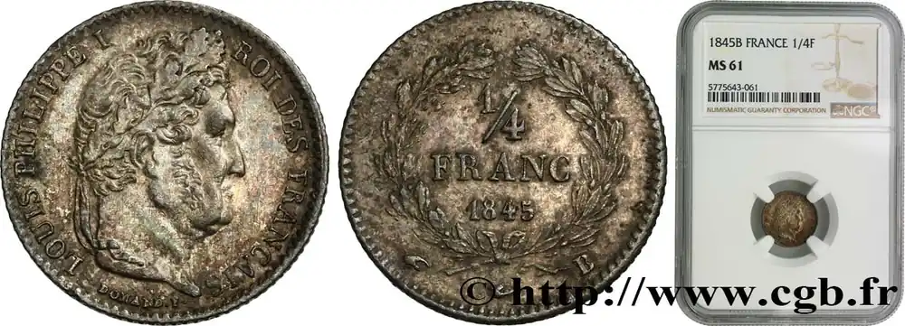 Type : 1/4 franc Louis-PhilippeDate : 1831Nom de l’atelier/ville : ParisQuantité frappée : 74696Métal : argentTitre en millième : 900 ‰Diamètre : 15 mmAxe des coins : 6 h.Poids : 1,23 g.Tranche : canneléeDegré de rareté : R1SlabNGC : AUCommentaires sur l’état de conservation :Sous coque NGC Rev Cleaned – AU DetailsRéférence ouvrage :Classement FRANC 2023 / FRANC 2023 classificationF.166/1Pedigree :Cet exemplaire provient des Collections William Applegate et Robert Laviana, Esq.AversTitulature avers : LOUIS PHILIPPE I ROI DES FRANÇAIS.Description avers : Tête de Louis-Philippe Ier à droite, portant une couronne de chêne terminée par un ruban descendant le long du cou, l’une des extrémités revenant sur le cou ; au-dessous DOMARD. F. le long du listel.ReversTitulature revers : 1/4 / FRANC.Description revers : en deux lignes, au-dessus de 1831, le tout dans une couronne nouée par un ruban à sa base, formée à gauche d’une branche de laurier, à droite d’une branche d’olivier ; au-dessous différent du graveur général encadré de la lettre d’atelier A à droite et du différent de maître à gauche.HistoriqueLOUIS-PHILIPPE Ier(7/08/1830-24/02/1848) Né à Paris en 1773, Louis-Philippe est le fils aîné de Louis-Philippe Joseph, duc d’Orléans (Philippe-Égalité), guillotiné en 1793 pour corruption après avoir voté la mort de son cousin Louis XVI. Il porte successivement les titres de duc de Valois, de Chartres puis d’Orléans à compter de 1793. Favorable à la Révolution, comme son père, il doit néanmoins se réfugier en Suisse puis il voyage en Scandinavie, aux États-Unis et enfin s’établit en Angleterre en 1801. La Restauration lui permet de retrouver les biens immenses de sa famille mais il reste considéré comme un rival potentiel par Louis XVIII qui le reçoit froidement. Réfugié en Angleterre lors des Cent-Jours, il revient en France en 1817. Âpre au gain, il donne son appui à l’opposition représentée par le parti libéral tout en s’appuyant sur la haute bourgeoisie possédante. Les journées de 1830 lui donnent l’occasion d’accéder au pouvoir après avoir adhéré au drapeau tricolore et multiplié les promesses. Il devient le 31 juillet 1830 lieutenant général du royaume puis roi des Français le 7 août. Son règne, sous une apparence libérale, va devenir celui de la bourgeoisie et des milieux d’affaires tandis que les oppositions (légitimistes, bonapartistes, républicaines et socialistes) sont maintenues dans l’illégalité. Sa politique de paix et son autorité lui valent alors un prestige important auprès des cours européennes. Le banquier Laffitte est Premier ministre. La Fayette est l’un des artisans de cette « révolution bourgeoise ». Le 13 mars 1831, Casimir Périer remplace Laffitte. La France intervient en Belgique en août 1831 pour contrer les Hollandais. Les Légitimistes, avec le complot de la rue des Prouvaires, tentent d’établir Henri V comme roi tandis que sa mère essaie de soulever la Vendée. Elle est arrêtée le 3 décembre 1832 à Nantes. L’épidémie de choléra tue plus de dix mille personnes à Paris, dont Casimir Périer. Les obsèques du général Lamarque sont l’occasion d’une tentative de soulèvement républicain, écrasé dans le sang (cf. Les Misérables). Les Français occupent Anvers le 23 décembre 1832. L’attentat de Fieschi du 28 juillet 1835 contre Louis-Philippe tue dix-huit personnes dont le maréchal Mortier. La première ligne de chemin de fer Paris-Orléans et la colonne de Juillet sont inaugurées respectivement les 24 octobre 1837 et 28 juillet 1840. L’année 1840 marque un tournant dans le régime, d’une grande instabilité ministérielle avant d’avoir le ministère Guizot (« Enrichissez-vous ! »). Le prince Louis-Napoléon Bonaparte, après une seconde tentative de putsch, est condamné à la réclusion perpétuelle et enfermé au fort de Ham dont il s’échappera en 1846. Les cendres de Napoléon sont ramenées de Sainte-Hélène et transférées aux Invalides. À partir de 1841, Louis-Philippe engage la France sur la voie de la conquête totale de l’Algérie, déjà commencée sous Charles X, tandis que se développe un important essor économique en Métropole. Une loi limite en 1841 le travail des enfants à 12 heures. Le premier accident grave de chemin de fer a lieu sur la ligne Paris-Versailles et fait 45 morts le 8 mai 1842. Le 13 juillet, le duc d’Orléans, fils aîné du roi, meurt accidentellement. Le 16 mai 1843, le duc d’Aumale prend la smala d’Abd-el-Kader qui parvient à s’enfuir. Bugeaud, gouverneur de l’Algérie, est fait Maréchal. 1843, c’est aussi le début de l’Entente Cordiale et la visite de la reine Victoria en France. Les Français battent les Marocains à Isly. Abd-el-Kader se rend le 23 décembre 1847. Le refus de réformes entraîne la chute du régime lors de la Campagne des Banquets et Louis-Philippe, détrôné le 24 février 1848, se réfugie en Angleterre après avoir abdiqué en faveur de son petit-fils.