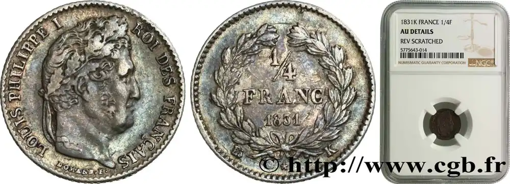 Type : 1/4 franc Louis-PhilippeDate : 1832Nom de l’atelier/ville : StrasbourgQuantité frappée : 11064Métal : argentTitre en millième : 900 ‰Diamètre : 15 mmAxe des coins : 6 h.Poids : 1,24 g.Tranche : canneléeDegré de rareté : R2Commentaires sur l’état de conservation :Exemplaire nettoyéRéférence ouvrage :Classement FRANC 2023 / FRANC 2023 classificationF.166/17AversTitulature avers : LOUIS PHILIPPE I ROI DES FRANÇAIS.Description avers : Tête de Louis-Philippe Ier à droite, portant une couronne de chêne terminée par un ruban descendant le long du cou, l’une des extrémités revenant sur le cou ; au-dessous DOMARD. F. le long du listel.ReversTitulature revers : 1/4 / FRANC.Description revers : en deux lignes, au-dessus de 1832, le tout dans une couronne nouée par un ruban à sa base, formée à gauche d’une branche de laurier, à droite d’une branche d’olivier ; au-dessous différent du graveur général encadré de la lettre d’atelier BB à droite et du différent de maître à gauche.HistoriqueLOUIS-PHILIPPE Ier(7/08/1830-24/02/1848) Né à Paris en 1773, Louis-Philippe est le fils aîné de Louis-Philippe Joseph, duc d’Orléans (Philippe-Égalité), guillotiné en 1793 pour corruption après avoir voté la mort de son cousin Louis XVI. Il porte successivement les titres de duc de Valois, de Chartres puis d’Orléans à compter de 1793. Favorable à la Révolution, comme son père, il doit néanmoins se réfugier en Suisse puis il voyage en Scandinavie, aux États-Unis et enfin s’établit en Angleterre en 1801. La Restauration lui permet de retrouver les biens immenses de sa famille mais il reste considéré comme un rival potentiel par Louis XVIII qui le reçoit froidement. Réfugié en Angleterre lors des Cent-Jours, il revient en France en 1817. Âpre au gain, il donne son appui à l’opposition représentée par le parti libéral tout en s’appuyant sur la haute bourgeoisie possédante. Les journées de 1830 lui donnent l’occasion d’accéder au pouvoir après avoir adhéré au drapeau tricolore et multiplié les promesses. Il devient le 31 juillet 1830 lieutenant général du royaume puis roi des Français le 7 août. Son règne, sous une apparence libérale, va devenir celui de la bourgeoisie et des milieux d’affaires tandis que les oppositions (légitimistes, bonapartistes, républicaines et socialistes) sont maintenues dans l’illégalité. Sa politique de paix et son autorité lui valent alors un prestige important auprès des cours européennes. Le banquier Laffitte est Premier ministre. La Fayette est l’un des artisans de cette « révolution bourgeoise ». Le 13 mars 1831, Casimir Périer remplace Laffitte. La France intervient en Belgique en août 1831 pour contrer les Hollandais. Les Légitimistes, avec le complot de la rue des Prouvaires, tentent d’établir Henri V comme roi tandis que sa mère essaie de soulever la Vendée. Elle est arrêtée le 3 décembre 1832 à Nantes. L’épidémie de choléra tue plus de dix mille personnes à Paris, dont Casimir Périer. Les obsèques du général Lamarque sont l’occasion d’une tentative de soulèvement républicain, écrasé dans le sang (cf. Les Misérables). Les Français occupent Anvers le 23 décembre 1832. L’attentat de Fieschi du 28 juillet 1835 contre Louis-Philippe tue dix-huit personnes dont le maréchal Mortier. La première ligne de chemin de fer Paris-Orléans et la colonne de Juillet sont inaugurées respectivement les 24 octobre 1837 et 28 juillet 1840. L’année 1840 marque un tournant dans le régime, d’une grande instabilité ministérielle avant d’avoir le ministère Guizot (« Enrichissez-vous ! »). Le prince Louis-Napoléon Bonaparte, après une seconde tentative de putsch, est condamné à la réclusion perpétuelle et enfermé au fort de Ham dont il s’échappera en 1846. Les cendres de Napoléon sont ramenées de Sainte-Hélène et transférées aux Invalides. À partir de 1841, Louis-Philippe engage la France sur la voie de la conquête totale de l’Algérie, déjà commencée sous Charles X, tandis que se développe un important essor économique en Métropole. Une loi limite en 1841 le travail des enfants à 12 heures. Le premier accident grave de chemin de fer a lieu sur la ligne Paris-Versailles et fait 45 morts le 8 mai 1842. Le 13 juillet, le duc d’Orléans, fils aîné du roi, meurt accidentellement. Le 16 mai 1843, le duc d’Aumale prend la smala d’Abd-el-Kader qui parvient à s’enfuir. Bugeaud, gouverneur de l’Algérie, est fait Maréchal. 1843, c’est aussi le début de l’Entente Cordiale et la visite de la reine Victoria en France. Les Français battent les Marocains à Isly. Abd-el-Kader se rend le 23 décembre 1847. Le refus de réformes entraîne la chute du régime lors de la Campagne des Banquets et Louis-Philippe, détrôné le 24 février 1848, se réfugie en Angleterre après avoir abdiqué en faveur de son petit-fils.