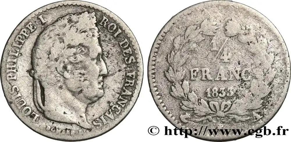 Type : 1/4 franc Louis-PhilippeDate : 1844Nom de l’atelier/ville : BordeauxQuantité frappée : 23131Métal : argentTitre en millième : 900 ‰Diamètre : 15 mmAxe des coins : 6 h.Poids : 1,20 g.Tranche : canneléeDegré de rareté : R2SlabNGC : AU55Commentaires sur l’état de conservation :Sous coque NGC AU55Référence ouvrage :Classement FRANC 2023 / FRANC 2023 classificationF.166/100Pedigree :Cet exemplaire provient des Collections William Applegate et Robert Laviana, Esq.AversTitulature avers : LOUIS PHILIPPE I ROI DES FRANÇAIS.Description avers : Tête de Louis-Philippe Ier à droite, portant une couronne de chêne terminée par un ruban descendant le long du cou, l’une des extrémités revenant sur le cou ; au-dessous DOMARD. F. le long du listel.ReversTitulature revers : 1/4 / FRANC.Description revers : en deux lignes, au-dessus de 1844, le tout dans une couronne nouée par un ruban à sa base, formée à gauche d’une branche de laurier, à droite d’une branche d’olivier ; au-dessous différent du graveur général encadré de la lettre d’atelier K à droite et du différent de maître à gauche.HistoriqueLOUIS-PHILIPPE Ier(7/08/1830-24/02/1848) Né à Paris en 1773, Louis-Philippe est le fils aîné de Louis-Philippe Joseph, duc d’Orléans (Philippe-Égalité), guillotiné en 1793 pour corruption après avoir voté la mort de son cousin Louis XVI. Il porte successivement les titres de duc de Valois, de Chartres puis d’Orléans à compter de 1793. Favorable à la Révolution, comme son père, il doit néanmoins se réfugier en Suisse puis il voyage en Scandinavie, aux États-Unis et enfin s’établit en Angleterre en 1801. La Restauration lui permet de retrouver les biens immenses de sa famille mais il reste considéré comme un rival potentiel par Louis XVIII qui le reçoit froidement. Réfugié en Angleterre lors des Cent-Jours, il revient en France en 1817. Âpre au gain, il donne son appui à l’opposition représentée par le parti libéral tout en s’appuyant sur la haute bourgeoisie possédante. Les journées de 1830 lui donnent l’occasion d’accéder au pouvoir après avoir adhéré au drapeau tricolore et multiplié les promesses. Il devient le 31 juillet 1830 lieutenant général du royaume puis roi des Français le 7 août. Son règne, sous une apparence libérale, va devenir celui de la bourgeoisie et des milieux d’affaires tandis que les oppositions (légitimistes, bonapartistes, républicaines et socialistes) sont maintenues dans l’illégalité. Sa politique de paix et son autorité lui valent alors un prestige important auprès des cours européennes. Le banquier Laffitte est Premier ministre. La Fayette est l’un des artisans de cette « révolution bourgeoise ». Le 13 mars 1831, Casimir Périer remplace Laffitte. La France intervient en Belgique en août 1831 pour contrer les Hollandais. Les Légitimistes, avec le complot de la rue des Prouvaires, tentent d’établir Henri V comme roi tandis que sa mère essaie de soulever la Vendée. Elle est arrêtée le 3 décembre 1832 à Nantes. L’épidémie de choléra tue plus de dix mille personnes à Paris, dont Casimir Périer. Les obsèques du général Lamarque sont l’occasion d’une tentative de soulèvement républicain, écrasé dans le sang (cf. Les Misérables). Les Français occupent Anvers le 23 décembre 1832. L’attentat de Fieschi du 28 juillet 1835 contre Louis-Philippe tue dix-huit personnes dont le maréchal Mortier. La première ligne de chemin de fer Paris-Orléans et la colonne de Juillet sont inaugurées respectivement les 24 octobre 1837 et 28 juillet 1840. L’année 1840 marque un tournant dans le régime, d’une grande instabilité ministérielle avant d’avoir le ministère Guizot (« Enrichissez-vous ! »). Le prince Louis-Napoléon Bonaparte, après une seconde tentative de putsch, est condamné à la réclusion perpétuelle et enfermé au fort de Ham dont il s’échappera en 1846. Les cendres de Napoléon sont ramenées de Sainte-Hélène et transférées aux Invalides. À partir de 1841, Louis-Philippe engage la France sur la voie de la conquête totale de l’Algérie, déjà commencée sous Charles X, tandis que se développe un important essor économique en Métropole. Une loi limite en 1841 le travail des enfants à 12 heures. Le premier accident grave de chemin de fer a lieu sur la ligne Paris-Versailles et fait 45 morts le 8 mai 1842. Le 13 juillet, le duc d’Orléans, fils aîné du roi, meurt accidentellement. Le 16 mai 1843, le duc d’Aumale prend la smala d’Abd-el-Kader qui parvient à s’enfuir. Bugeaud, gouverneur de l’Algérie, est fait Maréchal. 1843, c’est aussi le début de l’Entente Cordiale et la visite de la reine Victoria en France. Les Français battent les Marocains à Isly. Abd-el-Kader se rend le 23 décembre 1847. Le refus de réformes entraîne la chute du régime lors de la Campagne des Banquets et Louis-Philippe, détrôné le 24 février 1848, se réfugie en Angleterre après avoir abdiqué en faveur de son petit-fils.