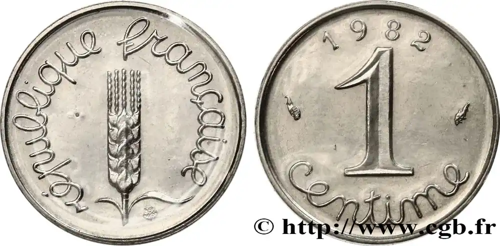 Type : 1 centime ÉpiDate : 1978Nom de l’atelier/ville : PessacQuantité frappée : 1342011Métal : acier inoxydableDiamètre : 15 mmAxe des coins : 6 h.Poids : 1,65 g.Tranche : lisseRéférence ouvrage :Classement FRANC 2023 / FRANC 2023 classificationF.106/33AversTitulature avers : RÉPUBLIQUE FRANÇAISE.Description avers : Épi de blé sur tige à deux feuilles asymétriques, terminé dans sa partie haute par cinq barbes ; sous la feuille de droite rosette de l’atelier de gravure ; légende en lettres cursives.ReversTitulature revers : 1 / CENTIME.Description revers : Légende en lettres cursives en deux lignes dans le champ, sous 1978, encadré par les différents (placés le long du listel).CommentaireExemplaire sous plastique et provenant d’une série Fleurs De Coins.HistoriqueCINQUIÈME RÉPUBLIQUE(depuis le 08/01/1959) La Cinquième République, dont la constitution a été approuvée par référendum le 28 septembre 1958 par plus de 79 % des Français, ne débute officiellement qu’avec l’installation du général de Gaulle comme président le 8 janvier 1959. La constitution est modifiée le 28 octobre 1962 par référendum où une majorité de 62 % des voix approuve l’élection du président de la République au suffrage universel direct. Les différents présidents de la Ve République sont Charles de Gaulle (8/01/1959 – 27/04/1969, retrait et Alain Poher devient président par intérim), Georges Pompidou (15/06/1969 – 2/04/1974, décédé, Alain Poher devient président par intérim), Valéry Giscard d’Estaing (19/05/1974 – 21/05/1981), François Mitterrand (21/05/1981 – 7/05/1995), Jacques Chirac (7/05/1995 – 16/05/2007) , Nicolas Sarkozy (16/05/2007 – 15/05/2012), François Hollande (15/05/2012 – 14/05/2017) et Emmanuel Macron (14/05/2017 – ).