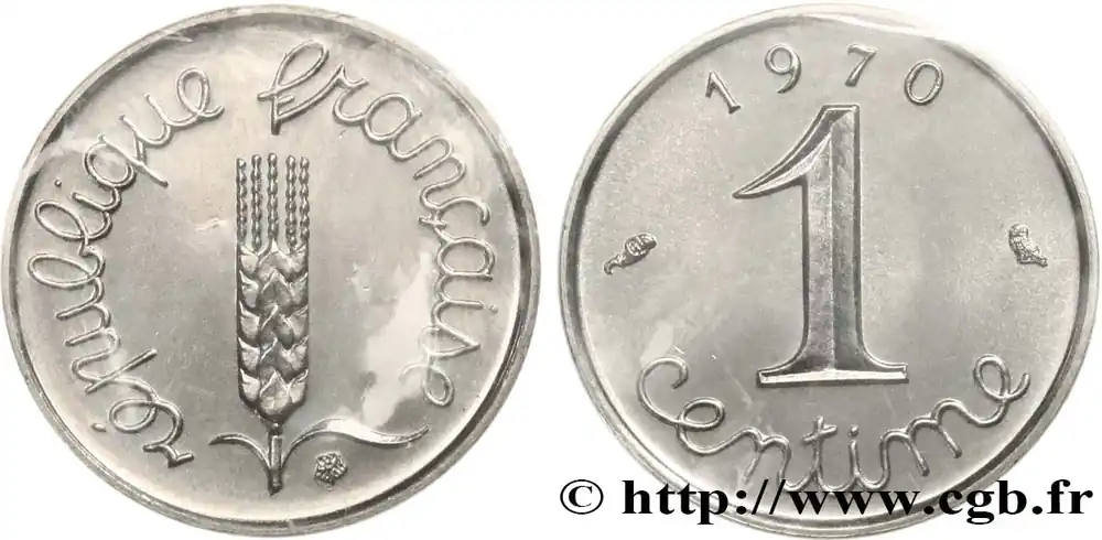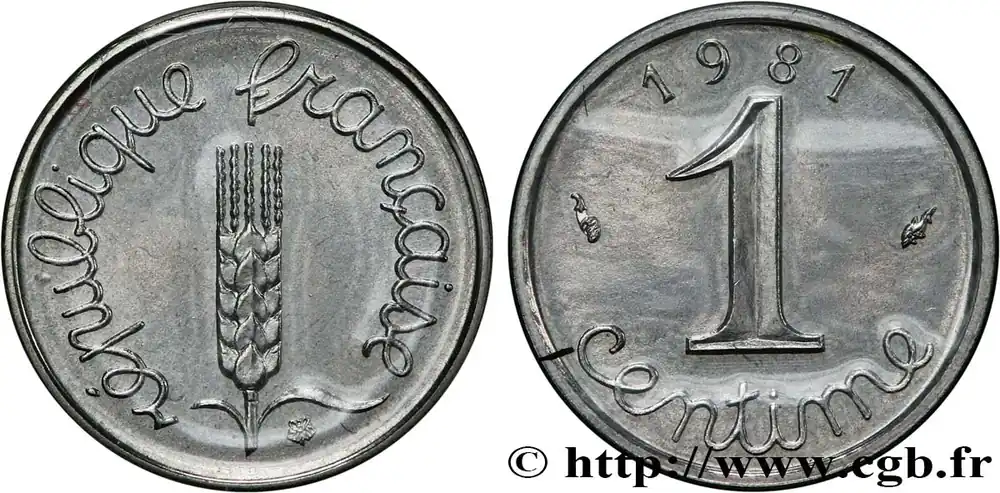 Type : 1 centime ÉpiDate : 1978Nom de l’atelier/ville : PessacQuantité frappée : 1342011Métal : acier inoxydableDiamètre : 15 mmAxe des coins : 6 h.Poids : 1,65 g.Tranche : lisseRéférence ouvrage :Classement FRANC 2023 / FRANC 2023 classificationF.106/33AversTitulature avers : RÉPUBLIQUE FRANÇAISE.Description avers : Épi de blé sur tige à deux feuilles asymétriques, terminé dans sa partie haute par cinq barbes ; sous la feuille de droite rosette de l’atelier de gravure ; légende en lettres cursives.ReversTitulature revers : 1 / CENTIME.Description revers : Légende en lettres cursives en deux lignes dans le champ, sous 1978, encadré par les différents (placés le long du listel).CommentaireExemplaire sous capsule et provenant d’une série FDC.HistoriqueCINQUIÈME RÉPUBLIQUE(depuis le 08/01/1959) La Cinquième République, dont la constitution a été approuvée par référendum le 28 septembre 1958 par plus de 79 % des Français, ne débute officiellement qu’avec l’installation du général de Gaulle comme président le 8 janvier 1959. La constitution est modifiée le 28 octobre 1962 par référendum où une majorité de 62 % des voix approuve l’élection du président de la République au suffrage universel direct. Les différents présidents de la Ve République sont Charles de Gaulle (8/01/1959 – 27/04/1969, retrait et Alain Poher devient président par intérim), Georges Pompidou (15/06/1969 – 2/04/1974, décédé, Alain Poher devient président par intérim), Valéry Giscard d’Estaing (19/05/1974 – 21/05/1981), François Mitterrand (21/05/1981 – 7/05/1995), Jacques Chirac (7/05/1995 – 16/05/2007) , Nicolas Sarkozy (16/05/2007 – 15/05/2012), François Hollande (15/05/2012 – 14/05/2017) et Emmanuel Macron (14/05/2017 – ).
