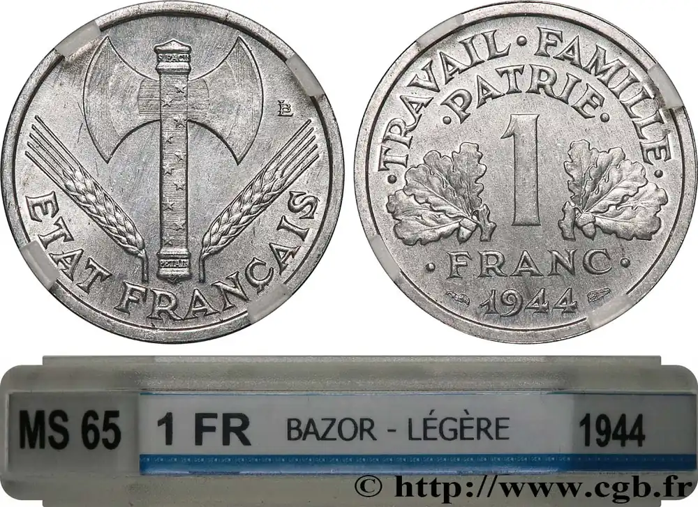Type : 1 franc Francisque, légèreDate : 1943Quantité frappée : 205.563.897Métal : aluminiumDiamètre : 23 mmAxe des coins : 6 h.Poids : 1,32 g.Tranche : lisseSlabGENI : MS64Commentaires sur l’état de conservation :Sous coque GENI MS64Référence ouvrage :Classement FRANC 2023 / FRANC 2023 classificationF.223/3AversTitulature avers : ETAT FRANÇAIS.Description avers : accostée de deux épis de blé, une francisque dont le manche est constitué par un bâton de maréchal orné de vingt-et-une étoiles dont dix étoiles à cinq rais visibles, portant en haut S. PACIS et en bas PETAIN, et les fers de trois bandes en drapeau français ; à droite de la francisque le monogramme LB pour Lucien Bazor.ReversTitulature revers : .TRAVAIL . FAMILLE. / .PATRIE..Description revers : 1 / .FRANC. au-dessus du millésime encadré des différents, accosté de deux rameaux de chêne, chacun étant composé de cinq feuilles et d’un gland.HistoriqueÉTAT FRANÇAIS(10/07/1940-26/08/1944) Né de l’effondrement de la Troisième République consécutif à la défaite française de mai-juin 1940, l’État français est fondé par un vote du Parlement réuni en Assemblée nationale à Vichy le 10 juillet 1940. L’Assemblée nationale par 569 oui, 80 non et 17 abstentions donne « tous pouvoirs au gouvernement de la République, sous l’autorité et la signature du maréchal Pétain, à l’effet de promulguer par un ou plusieurs actes une nouvelle constitution de l’État français ». Cette constitution doit « garantir les droits du Travail, de la Famille et de la Patrie ». Par six actes de 1940, la présidence de la République est supprimée au profit du maréchal Pétain, chef de l’État français. Une cour suprême de justice est créée. Le maréchal Pétain exerce un plein pouvoir non seulement gouvernemental mais aussi législatif puisqu’il nomme et révoque les ministres, et, il nomme à tous les emplois civils ou militaires. Il dispose aussi de la justice et de la force armée. Il négocie et ratifie les traités. À partir de 1941, tous les fonctionnaires doivent prêter serment au chef de l’État. Une réforme morale et intellectuelle s’attaque au divorce, à l’avortement, à l’alcoolisme, interdit la franc-maçonnerie et crée un commissariat aux Affaires Juives. Les syndicats sont supprimés et remplacés par un système corporatif. La famille est soutenue et la retraite des travailleurs est instituée. L’entrevue de Montoire du 24 octobre 1940 engage la France dans la voie de la collaboration qui devient totale dès juin 1941 avec les attentats de la résistance communiste. L’État français s’engage aussi aux côtés de l’Allemagne dans une croisade anti-bolchevique. Après la perte progressive de l’Empire, la zone sud est occupée par les Allemands provoquant le sabordage de la flotte à Toulon. Avec l’instauration du Service du Travail Obligatoire (S.T.O.), la résistance voit ses rangs augmenter. Les attentats, et leur répression, augmentent tandis que se forme le Conseil national de la Résistance. Le débarquement et les soulèvements de la résistance permettent au Gouvernement provisoire de la République française d’accroître son contrôle. Le 20 août 1944, le maréchal Pétain est emmené à Sigmaringen par les Allemands. Le 25, la division Leclerc est la première à entrer dans Paris en état d’insurrection, sonnant ainsi le glas du régime de Vichy.