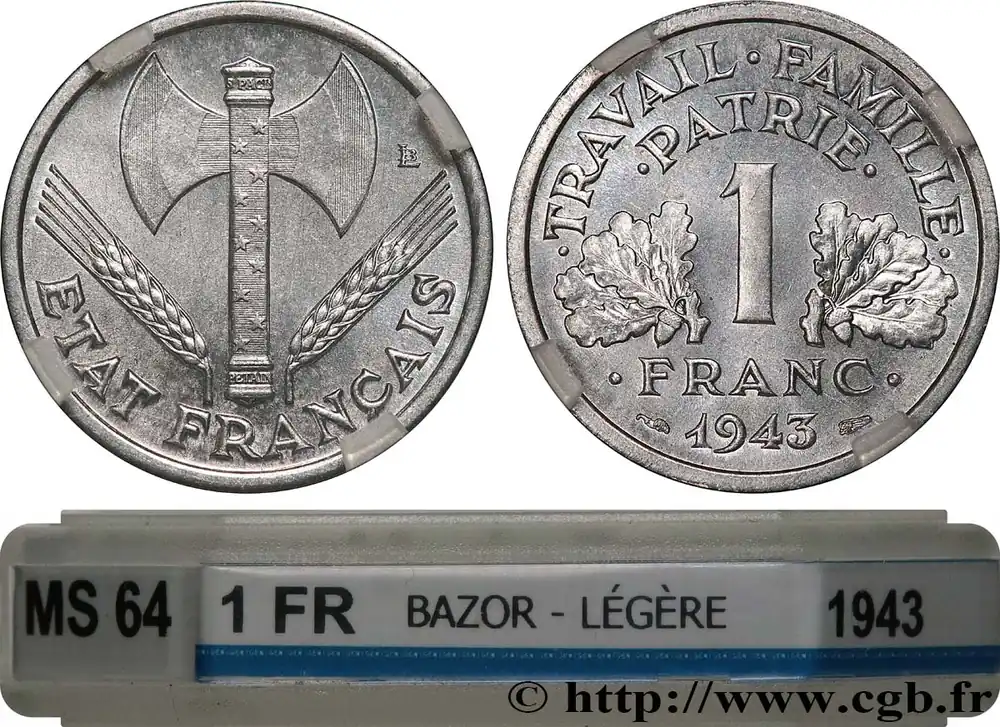 Type : 1 franc Francisque, légèreDate : 1943Quantité frappée : 205.563.897Métal : aluminiumDiamètre : 23 mmAxe des coins : 6 h.Poids : 1,3 g.Tranche : lisseSlabGENI : MS65Commentaires sur l’état de conservation :Sous coque GENI MS65Référence ouvrage :Classement FRANC 2023 / FRANC 2023 classificationF.223/3AversTitulature avers : ETAT FRANÇAIS.Description avers : accostée de deux épis de blé, une francisque dont le manche est constitué par un bâton de maréchal orné de vingt-et-une étoiles dont dix étoiles à cinq rais visibles, portant en haut S. PACIS et en bas PETAIN, et les fers de trois bandes en drapeau français ; à droite de la francisque le monogramme LB pour Lucien Bazor.ReversTitulature revers : .TRAVAIL . FAMILLE. / .PATRIE..Description revers : 1 / .FRANC. au-dessus du millésime encadré des différents, accosté de deux rameaux de chêne, chacun étant composé de cinq feuilles et d’un gland.HistoriqueÉTAT FRANÇAIS(10/07/1940-26/08/1944) Né de l’effondrement de la Troisième République consécutif à la défaite française de mai-juin 1940, l’État français est fondé par un vote du Parlement réuni en Assemblée nationale à Vichy le 10 juillet 1940. L’Assemblée nationale par 569 oui, 80 non et 17 abstentions donne « tous pouvoirs au gouvernement de la République, sous l’autorité et la signature du maréchal Pétain, à l’effet de promulguer par un ou plusieurs actes une nouvelle constitution de l’État français ». Cette constitution doit « garantir les droits du Travail, de la Famille et de la Patrie ». Par six actes de 1940, la présidence de la République est supprimée au profit du maréchal Pétain, chef de l’État français. Une cour suprême de justice est créée. Le maréchal Pétain exerce un plein pouvoir non seulement gouvernemental mais aussi législatif puisqu’il nomme et révoque les ministres, et, il nomme à tous les emplois civils ou militaires. Il dispose aussi de la justice et de la force armée. Il négocie et ratifie les traités. À partir de 1941, tous les fonctionnaires doivent prêter serment au chef de l’État. Une réforme morale et intellectuelle s’attaque au divorce, à l’avortement, à l’alcoolisme, interdit la franc-maçonnerie et crée un commissariat aux Affaires Juives. Les syndicats sont supprimés et remplacés par un système corporatif. La famille est soutenue et la retraite des travailleurs est instituée. L’entrevue de Montoire du 24 octobre 1940 engage la France dans la voie de la collaboration qui devient totale dès juin 1941 avec les attentats de la résistance communiste. L’État français s’engage aussi aux côtés de l’Allemagne dans une croisade anti-bolchevique. Après la perte progressive de l’Empire, la zone sud est occupée par les Allemands provoquant le sabordage de la flotte à Toulon. Avec l’instauration du Service du Travail Obligatoire (S.T.O.), la résistance voit ses rangs augmenter. Les attentats, et leur répression, augmentent tandis que se forme le Conseil national de la Résistance. Le débarquement et les soulèvements de la résistance permettent au Gouvernement provisoire de la République française d’accroître son contrôle. Le 20 août 1944, le maréchal Pétain est emmené à Sigmaringen par les Allemands. Le 25, la division Leclerc est la première à entrer dans Paris en état d’insurrection, sonnant ainsi le glas du régime de Vichy.