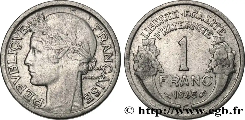 Type : 1 franc Morlon, légèreDate : 1945Nom de l’atelier/ville : Beaumont-Le-RogerQuantité frappée : 4.250.866Métal : aluminiumDiamètre : 23 mmAxe des coins : 6 h.Poids : 1,32 g.Tranche : lisseCommentaires sur l’état de conservation :Traces de nettoyageRéférence ouvrage :Classement FRANC 2023 / FRANC 2023 classificationF.221/7AversTitulature avers : REPVBLIQVE FRANÇAISE.Description avers : buste drapé de la République aux cheveux courts à gauche, coiffée d’un bonnet phrygien orné d’une cocarde tricolore (centre guilloché, cercle lisse, cercle guilloché), sous une couronne composite de blé, chêne et olivier nouée par un ruban ; sous le ruban MORLON.ReversTitulature revers : LIBERTE – EGALITE / FRATERNITE.Description revers : 1 / FRANC, en deux lignes au-dessus du millésime encadré des différents, le tout entre deux cornes d’abondance symétriquement opposées.HistoriqueGOUVERNEMENT PROVISOIRE DE LA RÉPUBLIQUE FRANÇAISE(26/08/1944-16/01/1947) Le Gouvernement Provisoire de la République Française (G.P.R.F.) est le nom donné au Comité Français de Libération Nationale (C.F.L.N.) dirigé par le général de Gaulle depuis juin 1944 et en prévision du débarquement allié. Reconnu par les États-Unis, peu à peu, le Gouvernement Provisoire de la République Française voit son autorité s’étendre aux régions libérées. Ce gouvernement est installé à Paris le 31 août 1944 et est remanié en septembre pour permettre l’entrée de personnalités issues de la résistance intérieure. Ce gouvernement reste en fonction jusqu’au 16 janvier 1947, date de l’élection de Vincent Auriol à la présidence de la Quatrième République. À sa tête se succédent le général de Gaulle, Félix Gouin, Georges Bidault et Léon Blum.