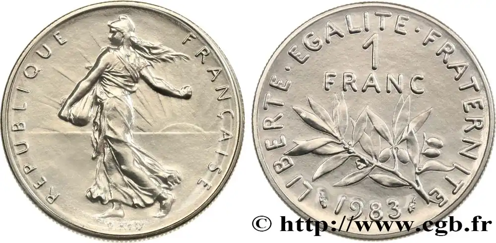 Type : 1 franc Semeuse, nickelDate : 1961Nom de l’atelier/ville : ParisQuantité frappée : 119.611.306Métal : nickelDiamètre : 24 mmAxe des coins : 6 h.Poids : 6 g.Tranche : striéeRéférence ouvrage :Classement FRANC 2023 / FRANC 2023 classificationF.226/6AversTitulature avers : REPUBLIQUE FRANÇAISE..Description avers : La République à gauche, sous les traits d’une semeuse drapée et coiffée d’un bonnet phrygien, aux cheveux longs, marchant et semant à contre-vent ; en arrière-plan, derrière la semeuse à droite, un soleil levant ; au-dessous, en creux O. ROTY.ReversTitulature revers : LIBERTE. EGALITE. FRATERNITE..Description revers : 1 / FRANC, en deux lignes au-dessus d’une branche d’olivier tournée à gauche; au-dessous, 1961 encadré des différents.HistoriqueCINQUIÈME RÉPUBLIQUE(depuis le 08/01/1959) La Cinquième République, dont la constitution a été approuvée par référendum le 28 septembre 1958 par plus de 79 % des Français, ne débute officiellement qu’avec l’installation du général de Gaulle comme président le 8 janvier 1959. La constitution est modifiée le 28 octobre 1962 par référendum où une majorité de 62 % des voix approuve l’élection du président de la République au suffrage universel direct. Les différents présidents de la Ve République sont Charles de Gaulle (8/01/1959 – 27/04/1969, retrait et Alain Poher devient président par intérim), Georges Pompidou (15/06/1969 – 2/04/1974, décédé, Alain Poher devient président par intérim), Valéry Giscard d’Estaing (19/05/1974 – 21/05/1981), François Mitterrand (21/05/1981 – 7/05/1995), Jacques Chirac (7/05/1995 – 16/05/2007) , Nicolas Sarkozy (16/05/2007 – 15/05/2012), François Hollande (15/05/2012 – 14/05/2017) et Emmanuel Macron (14/05/2017 – ).