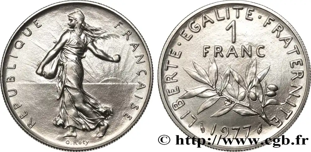 Type : 1 franc Semeuse, nickelDate : 1988Nom de l’atelier/ville : PessacQuantité frappée : 95.576Métal : nickelDiamètre : 24 mmAxe des coins : 6 h.Poids : 6 g.Tranche : striéeDegré de rareté : R1Référence ouvrage :Classement FRANC 2023 / FRANC 2023 classificationF.226/33AversTitulature avers : REPUBLIQUE FRANÇAISE..Description avers : La République à gauche, sous les traits d’une semeuse drapée et coiffée d’un bonnet phrygien, aux cheveux longs, marchant et semant à contre-vent ; en arrière-plan, derrière la semeuse à droite, un soleil levant ; au-dessous, en creux O. ROTY.ReversTitulature revers : LIBERTE. EGALITE. FRATERNITE..Description revers : 1 / FRANC, en deux lignes au-dessus d’une branche d’olivier tournée à gauche; au-dessous, 1988 encadré des différents.HistoriqueCINQUIÈME RÉPUBLIQUE(depuis le 08/01/1959) La Cinquième République, dont la constitution a été approuvée par référendum le 28 septembre 1958 par plus de 79 % des Français, ne débute officiellement qu’avec l’installation du général de Gaulle comme président le 8 janvier 1959. La constitution est modifiée le 28 octobre 1962 par référendum où une majorité de 62 % des voix approuve l’élection du président de la République au suffrage universel direct. Les différents présidents de la Ve République sont Charles de Gaulle (8/01/1959 – 27/04/1969, retrait et Alain Poher devient président par intérim), Georges Pompidou (15/06/1969 – 2/04/1974, décédé, Alain Poher devient président par intérim), Valéry Giscard d’Estaing (19/05/1974 – 21/05/1981), François Mitterrand (21/05/1981 – 7/05/1995), Jacques Chirac (7/05/1995 – 16/05/2007) , Nicolas Sarkozy (16/05/2007 – 15/05/2012), François Hollande (15/05/2012 – 14/05/2017) et Emmanuel Macron (14/05/2017 – ).