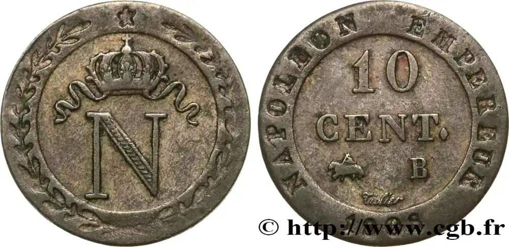 Type : 10 cent. à l’N couronnéeDate : 1809Nom de l’atelier/ville : LimogesQuantité frappée : 3472159Métal : billonTitre en millième : 200 ‰Diamètre : 19 mmAxe des coins : 6 h.Poids : 1,94 g.Tranche : lisseCommentaires sur l’état de conservation :Des rayures au droitRéférence ouvrage :Classement FRANC 2023 / FRANC 2023 classificationF.130/15AversDescription avers : N au jambage strié sous une couronne impériale supportant un globe crucigère et ornée de deux rubans, le tout contenu dans un très large listel orné en creux d’une couronne ouverte composée de deux branches de laurier croisées à leur base ; une étoile à cinq rais en creux, dans le haut du listel.ReversTitulature revers : NAPOLEON EMPEREUR // 1809.Description revers : en creux, sur un large listel ; dans le champ central 10 / CENT (petit losange) en deux lignes au-dessus de la lettre d’atelier I à droite, du différent à gauche et de la signature cursive Tiolier au centre.HistoriquePREMIER EMPIRE(18/05/1804-6/04/1814) Renforcée par la conspiration de Cadoudal de mars 1804, l’idée du pouvoir héréditaire trouve son aboutissement le 18 mai 1804 lorsque Napoléon Bonaparte devient empereur des Français sous le nom de Napoléon Ier. Ratifié par plébiscite, l’Empire est consacré le 2 décembre 1804 lors du sacre de Notre-Dame. La Constitution de l’an XII étant toujours en vigueur, le Premier Empire semble fonctionner comme une continuation de la République française dirigée par un empereur. C’est en réalité une dictature personnelle où l’empereur nomme et révoque les ministres, a l’initiative des lois et contrôle le Corps législatif. Dans les départements, les préfets renseignent le ministère de l’Intérieur. Les postes, la presse, l’imprimerie sont contrôlées par la censure. Les grands corps de l’Etat sont réorganisés ainsi que la Justice avec le Code pénal qui complète le Code civil achevé sous le Consulat. Universités et écoles sont encadrées. En 1805, Napoléon devient roi d’Italie tandis que se forment des coalitions contre l’Empire. Malgré la défaite navale de Trafalgar, les armées impériales remportent de nombreuses victoires terrestres comme Austerlitz, Iéna ou Eylau qui assurent le contrôle de l’Europe continentale. Démembrée, celle-ci est attribuée à la famille Bonaparte qui semble triompher partout. Fortifiée par le blocus continental, l’industrie est prospère mais le commerce souffre. En 1808, le blocus continental est renforcé par un second décret pris à Milan en date du 17 décembre 1807. La guerre d’Espagne débute après que Junot ait conquis le Portugal qui refusait d’appliquer le blocus. Rapidement, les Madrilènes se soulèvent contre l’occupation française de Murat. Les 1er et 2 mai, les français répriment avec férocité des mouvements de guérilla. Des exécutions massives ont lieu. Elles sont immortalisées par Goya dans son célèbre Primer y Dos de Mayo. Joseph, roi de Naples, est nommé roi d’Espagne à contrecœur. Murat le remplace sur le trône de Naples avec sa femme Caroline. Malgré les abdications forcées de Charles IV et de Ferdinand VII à Bayonne, en présence de Napoléon, les Français assistent à un soulèvement général en Espagne et sont battus à Bailen le 22 juillet : ils perdent Madrid. Wellington et un corps expéditionnaire anglais débarquent au Portugal le 1er août. Junot doit capituler à Cintra le 30 août. Les Français reprennent Madrid le 4 décembre 1808. En avril 1809, Pie VII excommunie Napoléon qui le fait séquestrer en représailles. Les alliés forment la cinquième coalition, mais les Autrichiens sont battus à Eckmühl le 12 avril, Essling le 21 mai et Wagram le 6 juillet 1809. Au traité de Vienne, l’Autriche cède la Carniole, la Carinthie et la Croatie qui vont former les provinces illyriennes qui sont incorporées à l’Empire. La colonne Vendôme est inaugurée en 1810. Cette année là, Napoléon est au faîte de sa puissance et la France compte 130 départements du Tibre à l’Elbe. Après avoir divorcé d’avec Joséphine en décembre 1809, il épouse Marie-Louise d’Autriche le 2 avril 1810. Louis abdique du trône de Hollande, le 9 juillet 1810, refusant d’appliquer le Blocus Continental et le Royaume est annexé à la France. En 1811, l’Empereur, qui a fait dissoudre son mariage avec Joséphine, épouse l’archiduchesse Marie-Louise qui lui donne un fils, le roi de Rome qui naît aux Tuileries le 20 mars 1811. Les relations franco-russes se sont détériorées après le mariage autrichien. Finalement, Napoléon franchit le Niémen le 24 juin 1812. C’est le début de la campagne de Russie. À la tête de la Grande Armée, il prend Vilna (28 juin), remporte la victoire de Smolensk (18 août), puis la difficile bataille de la Moscova (5-7 septembre). Il prend Moscou entre le 15 et le 18 septembre. La ville est incendiée par les Russes et les Français doivent l’évacuer. La Grande Armée est obligée de faire retraite avec l’hiver russe qui commence très tôt et un ennemi qui pratique la politique de la terre brûlée. C’est la bataille de la Berezina le 27-29 novembre 1812. Sur 600.000 hommes, moins de 30.000 repassent la frontière russe. Le Général Malet tente un coup d’état à Paris le 23 octobre. Il est fusillé le 29. Les Russes occupent Varsovie, Hambourg et Dresde. Les Prussiens remportent les victoires de Lutzen et Bautzen les 2 et 21 mai 1813. Toute l’Europe se ligue contre Napoléon lors de la sixième coalition et il est battu à la bataille des Nations le 16-19 octobre 1813. La campagne de France commence en janvier 1814. Malgré les victoires de Montmirail et de Montereau les 10 et 18 février, Napoléon ne peut empêcher la capitulation de Paris le 31 mars. Il est contraint d’abdiquer le 6 avril 1814 et part sur l’île d’Elbe.