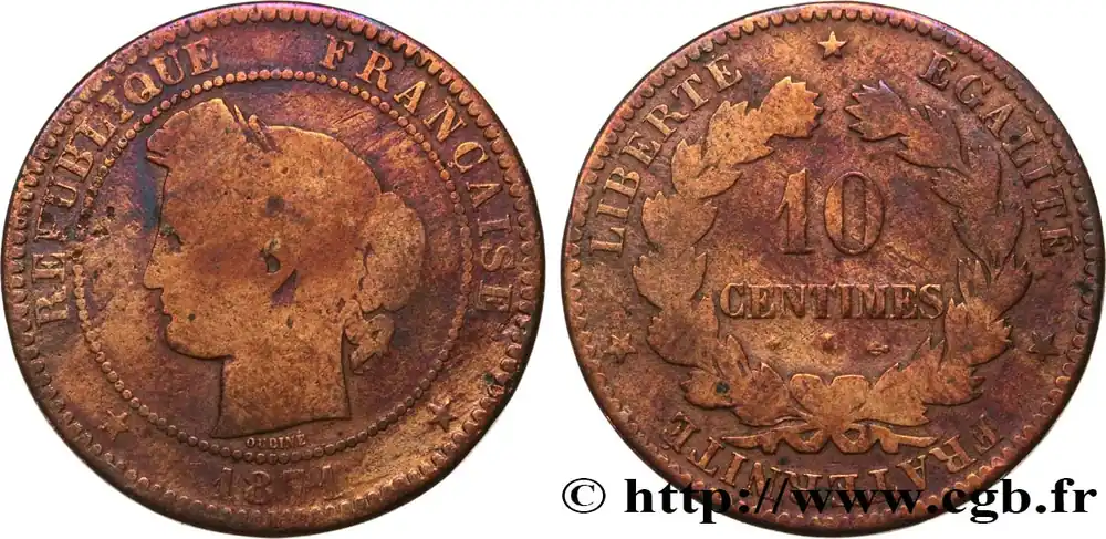 Type : 10 centimes CérèsDate : 1871Nom de l’atelier/ville : BordeauxQuantité frappée : 26500Métal : bronzeDiamètre : 30 mmAxe des coins : 6 h.Poids : 9,55 g.Tranche : lisseDegré de rareté : R2Référence ouvrage :Classement FRANC 2023 / FRANC 2023 classificationF.135/7AversTitulature avers : RÉPUBLIQUE FRANÇAISE// * (MILLÉSIME) *.Description avers : Tête de Cérès à gauche couronnée d’épis avec un bandeau inscrit CONCOR ; au-dessous signé OUDINÉ.ReversTitulature revers : * LIBERTÉ * ÉGALITÉ * FRATERNITÉ.Description revers : 10/ CENTIMES/ (Mm) K (ancre) dans une couronne formée d’une branche de laurier et d’une branche d’olivier.HistoriqueTROISIÈME RÉPUBLIQUE(4/09/1870-10/07/1940) La nouvelle de la capitulation de Sedan provoque la révolution du 4 septembre 1870 à Paris. Proclamée à l’Hôtel de Ville, la République est dotée d’un gouvernement provisoire appelé gouvernement de la Défense nationale. Menacé à gauche par l’insurrection de la Commune et à droite par les monarchistes, le nouveau régime connaît des débuts difficiles. Chef du pouvoir exécutif dans un premier temps (février 1871), Thiers est chargé de réorganiser le pays avant de choisir sa forme de gouvernement. Il devient président de la République en août 1871 et, malgré son action de libération du territoire, doit quitter son poste en mars 1873 face à l’opposition royaliste. Il est alors remplacé par Mac-Mahon favorable au rétablissement de la monarchie mais celle-ci n’est pas restaurée à la suite de la question du drapeau. La loi du septennat est alors mise en place en novembre 1873 puis, en 1875, sont votées les lois fondamentales qui servent de Constitution à la Troisième République. Régime parlementaire, elle se caractérise notamment par la nette prépondérance du pouvoir législatif sur le pouvoir exécutif. Anticléricale, la Troisième République rend l’école gratuite, laïque et obligatoire mais continue la politique coloniale pour ses ambitions économiques, stratégiques et morales. La séparation des Églises et de l’État est votée en 1905. L’idée d’une revanche sur l’Allemagne et un nationalisme important sont au cœur de la crise boulangiste, du scandale de Panama ou de l’affaire Dreyfus des années 1886-1899 tandis que la politique étrangère est très active notamment au Maroc et que la course aux armements se développe. La Première Guerre mondiale coûte cher à la France qui ne se relève qu’à partir de 1920 voire 1928 pour la monnaie avec le franc « Poincaré ». La crise de 1929 ne se fait sentir qu’à partir de 1932 mais dure jusqu’en 1939, période durant laquelle l’instabilité ministérielle est très importante. Vacillant en 1934, la Troisième République trouve un nouveau ciment unitaire avec l’antifascisme qui permet l’arrivée au pouvoir du Front populaire en 1936. Mais, paralysée face à l’Allemagne, la France va alors s’enliser dans une « drôle de guerre » puis connaître l’une des plus grandes défaites de son histoire en juin 1940. Réunies en Assemblée nationale à Vichy le 10 juillet 1940, les Chambres, pourtant élues en 1936, votent les pleins pouvoirs à Pétain dans une sorte de suicide collectif par 569 voix pour, 80 voix contre et 18 abstentions.