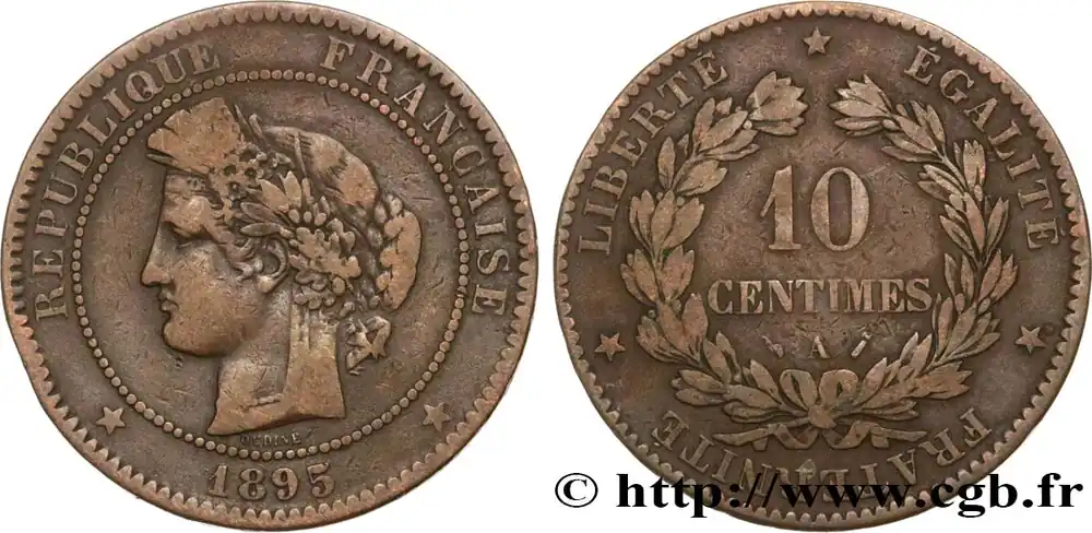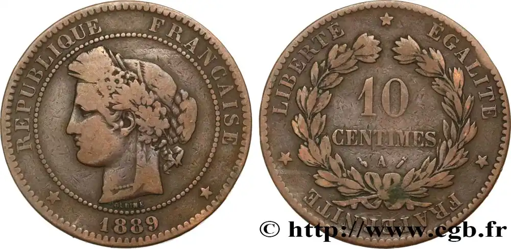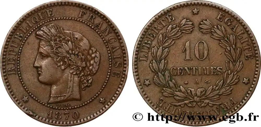Type : 10 centimes CérèsDate : 1878Nom de l’atelier/ville : ParisQuantité frappée : 150.000Métal : bronzeDiamètre : 30 mmAxe des coins : 6 h.Poids : 9,88 g.Tranche : lisseDegré de rareté : R1Commentaires sur l’état de conservation :Un coup sous l’étoile à 7h30 au droitRéférence ouvrage :Classement FRANC 2023 / FRANC 2023 classificationF.135/20AversTitulature avers : REPUBLIQUE FRANÇAISE // * (MILLÉSIME) *.Description avers : Tête de la République à gauche en Cérès, déesse des moissons, portant un collier de perles, un double chignon et une couronne composite de blé, fleurs, olivier et olives, chêne et glands, nouée par un ruban descendant sur le cou et passant sur le front où est inscrit le mot CONCOR ; sous la tranche du cou le long du grènetis OUDINÉ, le tout dans un grènetis.ReversTitulature revers : LIBERTÉ * ÉGALITÉ * FRATERNITÉ *.Description revers : 10 / CENTIMES, en deux lignes dans le champ, au-dessus de la lettre d’atelier encadrée des différents, dans une couronne ouverte nouée par un ruban à sa base, formée à gauche d’une branche de laurier, à droite d’une branche d’olivier.HistoriqueTROISIÈME RÉPUBLIQUE(4/09/1870-10/07/1940) La nouvelle de la capitulation de Sedan provoque la révolution du 4 septembre 1870 à Paris. Proclamée à l’Hôtel de Ville, la République est dotée d’un gouvernement provisoire appelé gouvernement de la Défense nationale. Menacé à gauche par l’insurrection de la Commune et à droite par les monarchistes, le nouveau régime connaît des débuts difficiles. Chef du pouvoir exécutif dans un premier temps (février 1871), Thiers est chargé de réorganiser le pays avant de choisir sa forme de gouvernement. Il devient président de la République en août 1871 et, malgré son action de libération du territoire, doit quitter son poste en mars 1873 face à l’opposition royaliste. Il est alors remplacé par Mac-Mahon favorable au rétablissement de la monarchie mais celle-ci n’est pas restaurée à la suite de la question du drapeau. La loi du septennat est alors mise en place en novembre 1873 puis, en 1875, sont votées les lois fondamentales qui servent de Constitution à la Troisième République. Régime parlementaire, elle se caractérise notamment par la nette prépondérance du pouvoir législatif sur le pouvoir exécutif. Anticléricale, la Troisième République rend l’école gratuite, laïque et obligatoire mais continue la politique coloniale pour ses ambitions économiques, stratégiques et morales. La séparation des Églises et de l’État est votée en 1905. L’idée d’une revanche sur l’Allemagne et un nationalisme important sont au cœur de la crise boulangiste, du scandale de Panama ou de l’affaire Dreyfus des années 1886-1899 tandis que la politique étrangère est très active notamment au Maroc et que la course aux armements se développe. La Première Guerre mondiale coûte cher à la France qui ne se relève qu’à partir de 1920 voire 1928 pour la monnaie avec le franc « Poincaré ». La crise de 1929 ne se fait sentir qu’à partir de 1932 mais dure jusqu’en 1939, période durant laquelle l’instabilité ministérielle est très importante. Vacillant en 1934, la Troisième République trouve un nouveau ciment unitaire avec l’antifascisme qui permet l’arrivée au pouvoir du Front populaire en 1936. Mais, paralysée face à l’Allemagne, la France va alors s’enliser dans une « drôle de guerre » puis connaître l’une des plus grandes défaites de son histoire en juin 1940. Réunies en Assemblée nationale à Vichy le 10 juillet 1940, les Chambres, pourtant élues en 1936, votent les pleins pouvoirs à Pétain dans une sorte de suicide collectif par 569 voix pour, 80 voix contre et 18 abstentions.