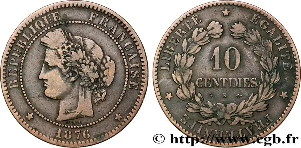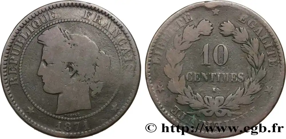 Type : 10 centimes CérèsDate : 1889Nom de l’atelier/ville : ParisQuantité frappée : 1.010.000Métal : bronzeDiamètre : 30 mmAxe des coins : 6 h.Poids : 9,88 g.Tranche : lisseRéférence ouvrage :Classement FRANC 2023 / FRANC 2023 classificationF.135/34AversTitulature avers : REPUBLIQUE FRANÇAISE // * (MILLÉSIME) *.Description avers : Tête de la République à gauche en Cérès, déesse des moissons, portant un collier de perles, un double chignon et une couronne composite de blé, fleurs, olivier et olives, chêne et glands, nouée par un ruban descendant sur le cou et passant sur le front où est inscrit le mot CONCOR ; sous la tranche du cou le long du grènetis OUDINÉ, le tout dans un grènetis.ReversTitulature revers : LIBERTÉ * ÉGALITÉ * FRATERNITÉ *.Description revers : 10 / CENTIMES, en deux lignes dans le champ, au-dessus de la lettre d’atelier encadrée des différents, dans une couronne ouverte nouée par un ruban à sa base, formée à gauche d’une branche de laurier, à droite d’une branche d’olivier.HistoriqueTROISIÈME RÉPUBLIQUE(4/09/1870-10/07/1940) La nouvelle de la capitulation de Sedan provoque la révolution du 4 septembre 1870 à Paris. Proclamée à l’Hôtel de Ville, la République est dotée d’un gouvernement provisoire appelé gouvernement de la Défense nationale. Menacé à gauche par l’insurrection de la Commune et à droite par les monarchistes, le nouveau régime connaît des débuts difficiles. Chef du pouvoir exécutif dans un premier temps (février 1871), Thiers est chargé de réorganiser le pays avant de choisir sa forme de gouvernement. Il devient président de la République en août 1871 et, malgré son action de libération du territoire, doit quitter son poste en mars 1873 face à l’opposition royaliste. Il est alors remplacé par Mac-Mahon favorable au rétablissement de la monarchie mais celle-ci n’est pas restaurée à la suite de la question du drapeau. La loi du septennat est alors mise en place en novembre 1873 puis, en 1875, sont votées les lois fondamentales qui servent de Constitution à la Troisième République. Régime parlementaire, elle se caractérise notamment par la nette prépondérance du pouvoir législatif sur le pouvoir exécutif. Anticléricale, la Troisième République rend l’école gratuite, laïque et obligatoire mais continue la politique coloniale pour ses ambitions économiques, stratégiques et morales. La séparation des Églises et de l’État est votée en 1905. L’idée d’une revanche sur l’Allemagne et un nationalisme important sont au cœur de la crise boulangiste, du scandale de Panama ou de l’affaire Dreyfus des années 1886-1899 tandis que la politique étrangère est très active notamment au Maroc et que la course aux armements se développe. La Première Guerre mondiale coûte cher à la France qui ne se relève qu’à partir de 1920 voire 1928 pour la monnaie avec le franc « Poincaré ». La crise de 1929 ne se fait sentir qu’à partir de 1932 mais dure jusqu’en 1939, période durant laquelle l’instabilité ministérielle est très importante. Vacillant en 1934, la Troisième République trouve un nouveau ciment unitaire avec l’antifascisme qui permet l’arrivée au pouvoir du Front populaire en 1936. Mais, paralysée face à l’Allemagne, la France va alors s’enliser dans une « drôle de guerre » puis connaître l’une des plus grandes défaites de son histoire en juin 1940. Réunies en Assemblée nationale à Vichy le 10 juillet 1940, les Chambres, pourtant élues en 1936, votent les pleins pouvoirs à Pétain dans une sorte de suicide collectif par 569 voix pour, 80 voix contre et 18 abstentions.