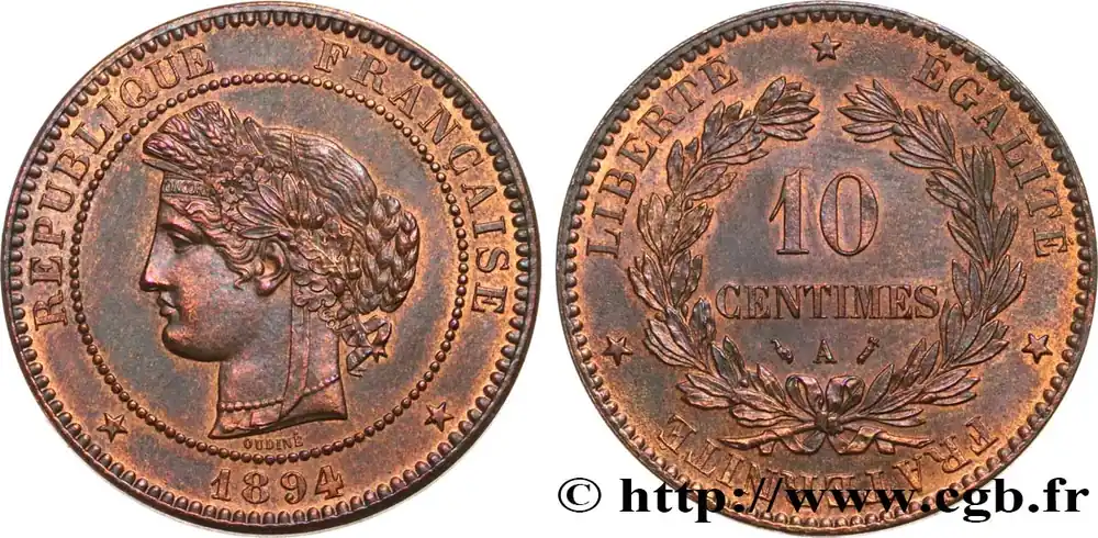 Type : 10 centimes CérèsDate : 1889Nom de l’atelier/ville : ParisQuantité frappée : 1.010.000Métal : bronzeDiamètre : 30 mmAxe des coins : 6 h.Poids : 10,02 g.Tranche : lisseRéférence ouvrage :Classement FRANC 2023 / FRANC 2023 classificationF.135/34AversTitulature avers : REPUBLIQUE FRANÇAISE // * (MILLÉSIME) *.Description avers : Tête de la République à gauche en Cérès, déesse des moissons, portant un collier de perles, un double chignon et une couronne composite de blé, fleurs, olivier et olives, chêne et glands, nouée par un ruban descendant sur le cou et passant sur le front où est inscrit le mot CONCOR ; sous la tranche du cou le long du grènetis OUDINÉ, le tout dans un grènetis.ReversTitulature revers : LIBERTÉ * ÉGALITÉ * FRATERNITÉ *.Description revers : 10 / CENTIMES, en deux lignes dans le champ, au-dessus de la lettre d’atelier encadrée des différents, dans une couronne ouverte nouée par un ruban à sa base, formée à gauche d’une branche de laurier, à droite d’une branche d’olivier.HistoriqueTROISIÈME RÉPUBLIQUE(4/09/1870-10/07/1940) La nouvelle de la capitulation de Sedan provoque la révolution du 4 septembre 1870 à Paris. Proclamée à l’Hôtel de Ville, la République est dotée d’un gouvernement provisoire appelé gouvernement de la Défense nationale. Menacé à gauche par l’insurrection de la Commune et à droite par les monarchistes, le nouveau régime connaît des débuts difficiles. Chef du pouvoir exécutif dans un premier temps (février 1871), Thiers est chargé de réorganiser le pays avant de choisir sa forme de gouvernement. Il devient président de la République en août 1871 et, malgré son action de libération du territoire, doit quitter son poste en mars 1873 face à l’opposition royaliste. Il est alors remplacé par Mac-Mahon favorable au rétablissement de la monarchie mais celle-ci n’est pas restaurée à la suite de la question du drapeau. La loi du septennat est alors mise en place en novembre 1873 puis, en 1875, sont votées les lois fondamentales qui servent de Constitution à la Troisième République. Régime parlementaire, elle se caractérise notamment par la nette prépondérance du pouvoir législatif sur le pouvoir exécutif. Anticléricale, la Troisième République rend l’école gratuite, laïque et obligatoire mais continue la politique coloniale pour ses ambitions économiques, stratégiques et morales. La séparation des Églises et de l’État est votée en 1905. L’idée d’une revanche sur l’Allemagne et un nationalisme important sont au cœur de la crise boulangiste, du scandale de Panama ou de l’affaire Dreyfus des années 1886-1899 tandis que la politique étrangère est très active notamment au Maroc et que la course aux armements se développe. La Première Guerre mondiale coûte cher à la France qui ne se relève qu’à partir de 1920 voire 1928 pour la monnaie avec le franc « Poincaré ». La crise de 1929 ne se fait sentir qu’à partir de 1932 mais dure jusqu’en 1939, période durant laquelle l’instabilité ministérielle est très importante. Vacillant en 1934, la Troisième République trouve un nouveau ciment unitaire avec l’antifascisme qui permet l’arrivée au pouvoir du Front populaire en 1936. Mais, paralysée face à l’Allemagne, la France va alors s’enliser dans une « drôle de guerre » puis connaître l’une des plus grandes défaites de son histoire en juin 1940. Réunies en Assemblée nationale à Vichy le 10 juillet 1940, les Chambres, pourtant élues en 1936, votent les pleins pouvoirs à Pétain dans une sorte de suicide collectif par 569 voix pour, 80 voix contre et 18 abstentions.