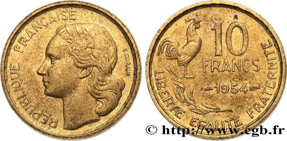 Type : 10 francs GuiraudDate : 1951Quantité frappée : 153.689.000Métal : bronze-aluminiumDiamètre : 20 mmAxe des coins : 6 h.Poids : 3,08 g.Tranche : lisseRéférence ouvrage :Classement FRANC 2023 / FRANC 2023 classificationF.363/4AversTitulature avers : RÉPUBLIQUE FRANÇAISE.Description avers : Tête de Marianne à gauche, coiffée du bonnet phrygien orné d’une cocarde ; signé G GUIRAUD derrière.ReversTitulature revers : 10 / FRANCS / 1951 // LIBERTE EGALITE FRATERNITE.Description revers : Coq debout à droite au-dessus d’une branche d’olivier.HistoriqueQUATRIÈME RÉPUBLIQUE(16/01/1947-8/01/1959) Se caractérisant par un régime parlementaire doublé d’une grande instabilité ministérielle, la Quatrième République a pour particularité de n’avoir jamais été officiellement proclamée. En effet, De Gaulle, lors de son arrivée à Paris le 25 août 1944, refuse de le faire sous prétexte que la République n’avait jamais cessé d’exister. Considérant que l’État français du maréchal Pétain n’était qu’un simple état de fait, il estime que la République a survécu dans la France libre et son acte de naissance doit alors être le 18 juin 1940. Toutefois, son départ, le 20 janvier 1946, et le référendum du 13 octobre 1946 approuvant une nouvelle Constitution, marquent le début officiel de cette république. Elle connaît deux présidents : Vincent Auriol (16/01/1947 – 23/12/1953) et René Coty (23/12/1953 – 8/1/1959). La crise ouverte causée par la révolte de l’armée d’Algérie entraîne, en 1958, sa chute qui est confirmée par l’adoption d’une nouvelle constitution le 28 septembre 1958. Néanmoins, elle ne cesse définitivement d’être que le 8 janvier 1959 lors de l’installation du général de Gaulle comme président de la Ve République.