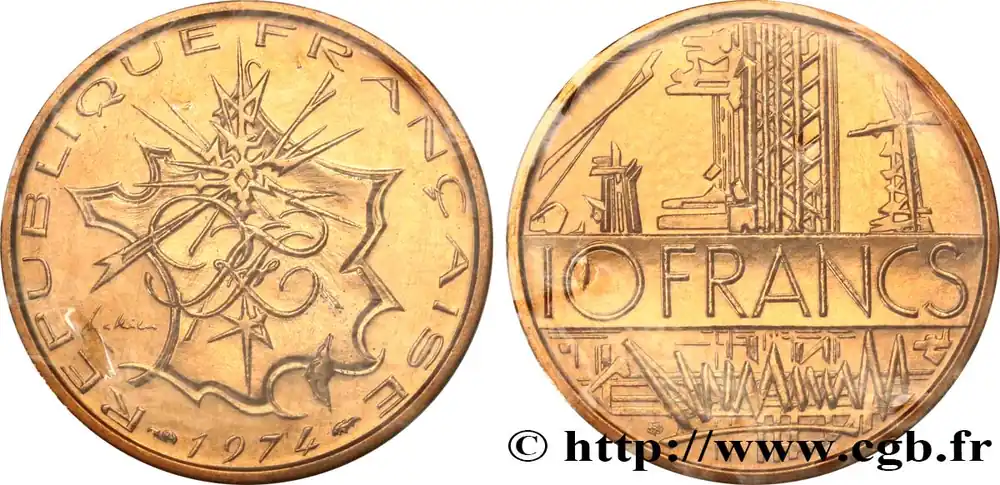 Type : 10 francs MathieuDate : 1980Nom de l’atelier/ville : PessacQuantité frappée : 80010011Métal : cupro-nickel-aluminiumDiamètre : 26 mmAxe des coins : 6 h.Poids : 10 g.Tranche : en creux. (branche de laurier) LIBERTE (branche d’olivier) EGALITE (épi) FRATERNITERéférence ouvrage :Classement FRANC 2023 / FRANC 2023 classificationF.365/8AversTitulature avers : REPUBLIQUE FRANÇAISE / 1980 ENCADRÉ DES DIFFÉRENTS.Description avers : Carte de France rayonnante avec au centre RF en majuscules entrelacées ; signé Mathieu dans le champ gauche.ReversTitulature revers : 10 FRANCS.Description revers : Représentations stylisées d’une France industrielle, formes de grues, de pylones et de bâtiments.CommentaireTranche A.Exemplaire sous plastique provenant d’une série Fleurs De Coins.HistoriqueCINQUIÈME RÉPUBLIQUE(depuis le 08/01/1959) La Cinquième République, dont la constitution a été approuvée par référendum le 28 septembre 1958 par plus de 79 % des Français, ne débute officiellement qu’avec l’installation du général de Gaulle comme président le 8 janvier 1959. La constitution est modifiée le 28 octobre 1962 par référendum où une majorité de 62 % des voix approuve l’élection du président de la République au suffrage universel direct. Les différents présidents de la Ve République sont Charles de Gaulle (8/01/1959 – 27/04/1969, retrait et Alain Poher devient président par intérim), Georges Pompidou (15/06/1969 – 2/04/1974, décédé, Alain Poher devient président par intérim), Valéry Giscard d’Estaing (19/05/1974 – 21/05/1981), François Mitterrand (21/05/1981 – 7/05/1995), Jacques Chirac (7/05/1995 – 16/05/2007) , Nicolas Sarkozy (16/05/2007 – 15/05/2012), François Hollande (15/05/2012 – 14/05/2017) et Emmanuel Macron (14/05/2017 – ).