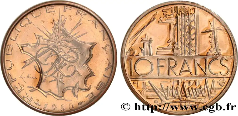 Type : 10 francs MathieuDate : 1984Nom de l’atelier/ville : PessacQuantité frappée : —Métal : cupro-nickel-aluminiumDiamètre : 26 mmAxe des coins : 6 h.Poids : 10 g.Tranche : en creux. (branche de laurier) LIBERTE (branche d’olivier) EGALITE (épi) FRATERNITERéférence ouvrage :Classement FRANC 2023 / FRANC 2023 classificationF.365/12AversTitulature avers : REPUBLIQUE FRANÇAISE / 1984 ENCADRÉ DES DIFFÉRENTS.Description avers : Carte de France rayonnante avec au centre RF en majuscules entrelacées ; signé Mathieu dans le champ gauche.ReversTitulature revers : 10 FRANCS.Description revers : Représentations stylisées d’une France industrielle, formes de grues, de pylones et de bâtiments.CommentaireTranche B. Tranche lisible la valeur faciale le revers vers le haut.Exemplaire sous plastique et découpé d’une série Fleurs De Coins.HistoriqueCINQUIÈME RÉPUBLIQUE(depuis le 08/01/1959) La Cinquième République, dont la constitution a été approuvée par référendum le 28 septembre 1958 par plus de 79 % des Français, ne débute officiellement qu’avec l’installation du général de Gaulle comme président le 8 janvier 1959. La constitution est modifiée le 28 octobre 1962 par référendum où une majorité de 62 % des voix approuve l’élection du président de la République au suffrage universel direct. Les différents présidents de la Ve République sont Charles de Gaulle (8/01/1959 – 27/04/1969, retrait et Alain Poher devient président par intérim), Georges Pompidou (15/06/1969 – 2/04/1974, décédé, Alain Poher devient président par intérim), Valéry Giscard d’Estaing (19/05/1974 – 21/05/1981), François Mitterrand (21/05/1981 – 7/05/1995), Jacques Chirac (7/05/1995 – 16/05/2007) , Nicolas Sarkozy (16/05/2007 – 15/05/2012), François Hollande (15/05/2012 – 14/05/2017) et Emmanuel Macron (14/05/2017 – ).