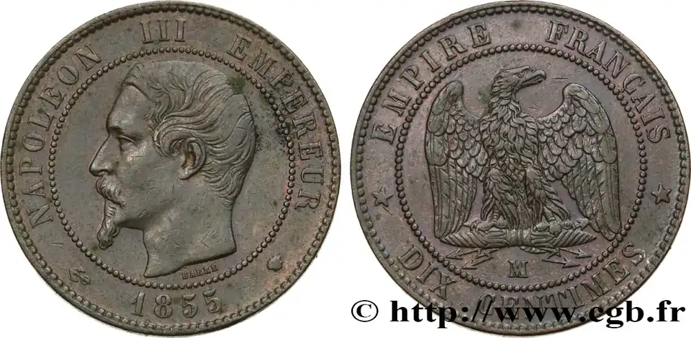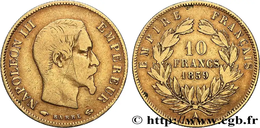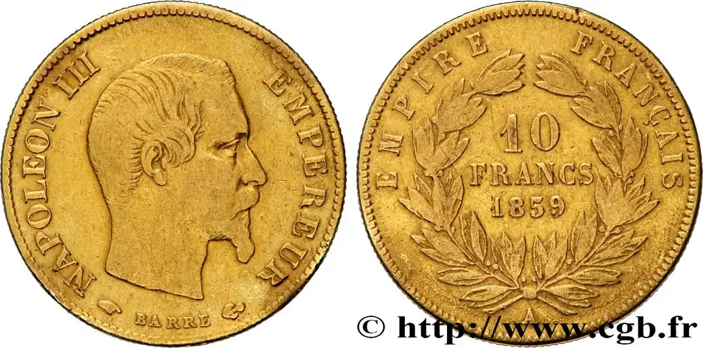 Type : 10 francs or Napoléon III, tête nueDate : 1856Nom de l’atelier/ville : ParisQuantité frappée : 10774115Métal : orTitre en millième : 900 ‰Diamètre : 19 mmAxe des coins : 6 h.Poids : 3,18 g.Tranche : canneléeCommentaires sur l’état de conservation :Exemplaire nettoyéRéférence ouvrage :Classement FRANC 2023 / FRANC 2023 classificationF.506/3AversTitulature avers : NAPOLEON III – EMPEREUR.Description avers : Tête nue de Napoléon III à droite ; signé (Mm) BARRE (ancre) sous le buste.ReversTitulature revers : EMPIRE FRANÇAIS/ A// 10/ FRANCS/ 1856 .Description revers : dans une couronne formée de deux branches de laurier.HistoriqueOR, PALLADIUM ET PLATINE INVESTISSEMENTSécurisez et diversifiez votre épargne avec les métaux précieux :Dans un contexte d’instabilité politique et économique croissante, diversifier son épargne peut être une démarche judicieuse. Les métaux précieux comme l’or, le palladium et le platine constituent des actifs tangibles souvent prisés en raison de leur caractère intemporel et de leur résilience face aux fluctuations des marchés.Pour répondre à des besoins variés, l’achat de pièces officielles en or, palladium ou platine est une option flexible et adaptée. Ces pièces, disponibles à l’unité ou en lot, permettent à chacun d’ajuster ses choix selon ses objectifs et son budget, sans engagement à long terme.Un processus simple et sécurisé :Nous proposons une livraison sécurisée et garantie. Les paiements peuvent être effectués par carte bancaire ou par virement, bien que certaines transactions puissent nécessiter un règlement exclusivement par virement bancaire. Une pièce d’identité valide (carte nationale d’identité ou passeport) sera demandée pour finaliser votre achat.Stockage en toute sécurité et confidentialité :Le département Investissement de CGB Numismatique Paris met à votre disposition des solutions de stockage offrant une sécurité renforcée et une confidentialité optimale pour vos achats en or, palladium et platine.Contactez-nous pour plus d’informations :Pour toute question ou pour passer commande, prenez contact avec notre responsable des achats/ventes de métaux précieux : par email à [email protected] ou par téléphone. Nous mettons à votre disposition des informations générales et des services pour vous accompagner dans vos projets d’investissement.CGB Numismatique Paris agit en tant que fournisseur de métaux précieux et ne fournit aucun conseil en investissement. La valeur des métaux précieux peut fluctuer, et les performances passées ne garantissent pas les résultats futurs. L’achat de métaux précieux doit être considéré comme une stratégie de préservation de valeur plutôt qu’un investissement spéculatif. Conformément à l’article L.221-28 du Code de la consommation, le droit de rétractation ne s’applique pas aux achats d’or d’investissement, dont le prix dépend des fluctuations des marchés financiers.
