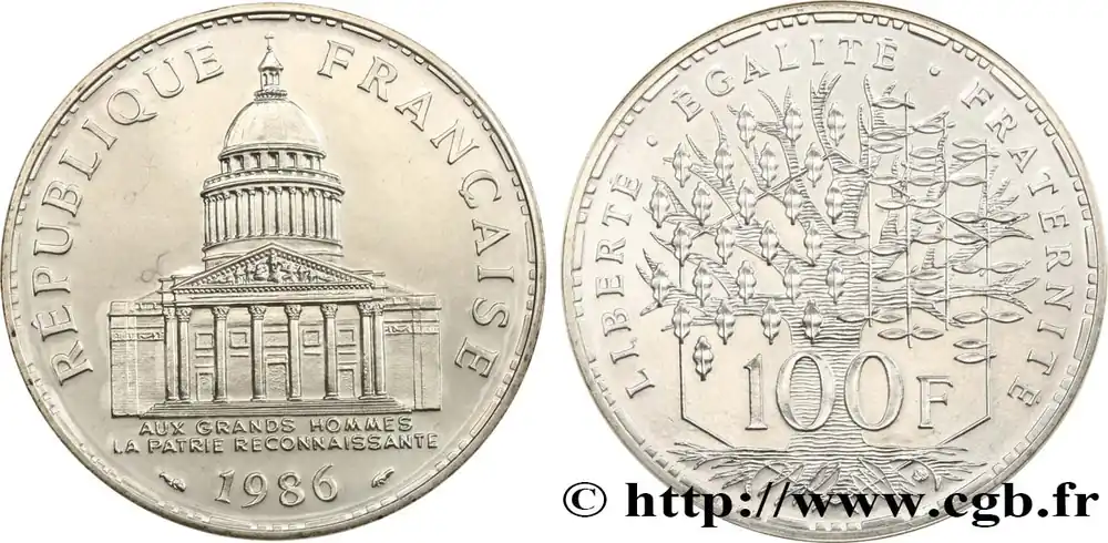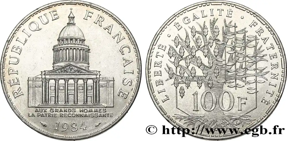 Type : 100 francs PanthéonDate : 1983Quantité frappée : 5.000.972Métal : argentDiamètre : 31 mmAxe des coins : 6 h.Poids : 15 g.Tranche : lisseRéférence ouvrage :Classement FRANC 2023 / FRANC 2023 classificationF.451/3AversTitulature avers : RÉPUBLIQUE – FRANÇAISE // 1983.Description avers : Panthéon représenté avec la phrase : AUX GRANDS HOMMES LA PATRIE RECONNAISSANTE.ReversTitulature revers : LIBERTÉ . ÉGALITÉ . FRATERNITÉ // 100 F.Description revers : Arbre massif avec en arrière plan la représentation d’un hexagone.HistoriqueCINQUIÈME RÉPUBLIQUE(depuis le 08/01/1959) La Cinquième République, dont la constitution a été approuvée par référendum le 28 septembre 1958 par plus de 79 % des Français, ne débute officiellement qu’avec l’installation du général de Gaulle comme président le 8 janvier 1959. La constitution est modifiée le 28 octobre 1962 par référendum où une majorité de 62 % des voix approuve l’élection du président de la République au suffrage universel direct. Les différents présidents de la Ve République sont Charles de Gaulle (8/01/1959 – 27/04/1969, retrait et Alain Poher devient président par intérim), Georges Pompidou (15/06/1969 – 2/04/1974, décédé, Alain Poher devient président par intérim), Valéry Giscard d’Estaing (19/05/1974 – 21/05/1981), François Mitterrand (21/05/1981 – 7/05/1995), Jacques Chirac (7/05/1995 – 16/05/2007) , Nicolas Sarkozy (16/05/2007 – 15/05/2012), François Hollande (15/05/2012 – 14/05/2017) et Emmanuel Macron (14/05/2017 – ).