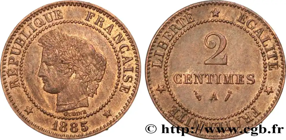 Type : 2 centimes CérèsDate : 1883Nom de l’atelier/ville : ParisQuantité frappée : 500000Métal : bronzeDiamètre : 20 mmAxe des coins : 6 h.Tranche : lisseRéférence ouvrage :Classement FRANC 2023 / FRANC 2023 classificationF.109/8Pedigree :Collection S8AversTitulature avers : RÉPUBLIQUE FRANÇAISE// * (MILLÉSIME) *.Description avers : Tête de Cérès à gauche couronnée d’épis avec un bandeau inscrit CONCOR ; au-dessous signé OUDINE.ReversTitulature revers : *LIBERTÉ* ÉGALITÉ* FRATERNITÉ.Description revers : 2/ CENTIMES/ (corne) A (Mm) dans un cordon perlé.HistoriqueTROISIÈME RÉPUBLIQUE(4/09/1870-10/07/1940) La nouvelle de la capitulation de Sedan provoque la révolution du 4 septembre 1870 à Paris. Proclamée à l’Hôtel de Ville, la République est dotée d’un gouvernement provisoire appelé gouvernement de la Défense nationale. Menacé à gauche par l’insurrection de la Commune et à droite par les monarchistes, le nouveau régime connaît des débuts difficiles. Chef du pouvoir exécutif dans un premier temps (février 1871), Thiers est chargé de réorganiser le pays avant de choisir sa forme de gouvernement. Il devient président de la République en août 1871 et, malgré son action de libération du territoire, doit quitter son poste en mars 1873 face à l’opposition royaliste. Il est alors remplacé par Mac-Mahon favorable au rétablissement de la monarchie mais celle-ci n’est pas restaurée à la suite de la question du drapeau. La loi du septennat est alors mise en place en novembre 1873 puis, en 1875, sont votées les lois fondamentales qui servent de Constitution à la Troisième République. Régime parlementaire, elle se caractérise notamment par la nette prépondérance du pouvoir législatif sur le pouvoir exécutif. Anticléricale, la Troisième République rend l’école gratuite, laïque et obligatoire mais continue la politique coloniale pour ses ambitions économiques, stratégiques et morales. La séparation des Églises et de l’État est votée en 1905. L’idée d’une revanche sur l’Allemagne et un nationalisme important sont au cœur de la crise boulangiste, du scandale de Panama ou de l’affaire Dreyfus des années 1886-1899 tandis que la politique étrangère est très active notamment au Maroc et que la course aux armements se développe. La Première Guerre mondiale coûte cher à la France qui ne se relève qu’à partir de 1920 voire 1928 pour la monnaie avec le franc « Poincaré ». La crise de 1929 ne se fait sentir qu’à partir de 1932 mais dure jusqu’en 1939, période durant laquelle l’instabilité ministérielle est très importante. Vacillant en 1934, la Troisième République trouve un nouveau ciment unitaire avec l’antifascisme qui permet l’arrivée au pouvoir du Front populaire en 1936. Mais, paralysée face à l’Allemagne, la France va alors s’enliser dans une « drôle de guerre » puis connaître l’une des plus grandes défaites de son histoire en juin 1940. Réunies en Assemblée nationale à Vichy le 10 juillet 1940, les Chambres, pourtant élues en 1936, votent les pleins pouvoirs à Pétain dans une sorte de suicide collectif par 569 voix pour, 80 voix contre et 18 abstentions.