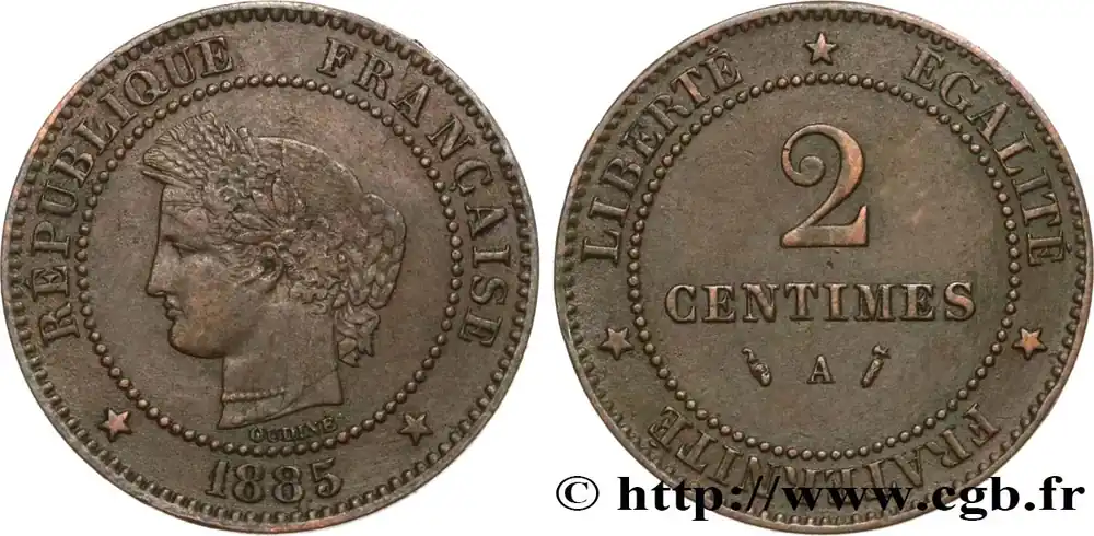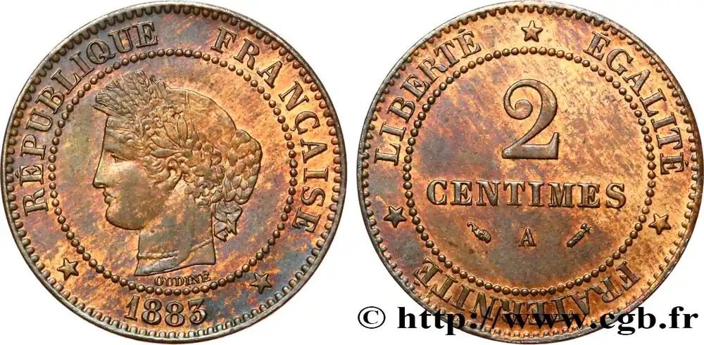 Type : 2 centimes CérèsDate : 1893Nom de l’atelier/ville : ParisQuantité frappée : 250000Métal : bronzeDiamètre : 20 mmAxe des coins : 6 h.Poids : 2,03 g.Tranche : lisseRéférence ouvrage :Classement FRANC 2023 / FRANC 2023 classificationF.109/19AversTitulature avers : RÉPUBLIQUE FRANÇAISE// * (MILLÉSIME) *.Description avers : Tête de Cérès à gauche couronnée d’épis avec un bandeau inscrit CONCOR ; au-dessous signé OUDINE.ReversTitulature revers : *LIBERTÉ* ÉGALITÉ* FRATERNITÉ.Description revers : 2/ CENTIMES/ (corne) A (Mm) dans un cordon perlé.HistoriqueTROISIÈME RÉPUBLIQUE(4/09/1870-10/07/1940) La nouvelle de la capitulation de Sedan provoque la révolution du 4 septembre 1870 à Paris. Proclamée à l’Hôtel de Ville, la République est dotée d’un gouvernement provisoire appelé gouvernement de la Défense nationale. Menacé à gauche par l’insurrection de la Commune et à droite par les monarchistes, le nouveau régime connaît des débuts difficiles. Chef du pouvoir exécutif dans un premier temps (février 1871), Thiers est chargé de réorganiser le pays avant de choisir sa forme de gouvernement. Il devient président de la République en août 1871 et, malgré son action de libération du territoire, doit quitter son poste en mars 1873 face à l’opposition royaliste. Il est alors remplacé par Mac-Mahon favorable au rétablissement de la monarchie mais celle-ci n’est pas restaurée à la suite de la question du drapeau. La loi du septennat est alors mise en place en novembre 1873 puis, en 1875, sont votées les lois fondamentales qui servent de Constitution à la Troisième République. Régime parlementaire, elle se caractérise notamment par la nette prépondérance du pouvoir législatif sur le pouvoir exécutif. Anticléricale, la Troisième République rend l’école gratuite, laïque et obligatoire mais continue la politique coloniale pour ses ambitions économiques, stratégiques et morales. La séparation des Églises et de l’État est votée en 1905. L’idée d’une revanche sur l’Allemagne et un nationalisme important sont au cœur de la crise boulangiste, du scandale de Panama ou de l’affaire Dreyfus des années 1886-1899 tandis que la politique étrangère est très active notamment au Maroc et que la course aux armements se développe. La Première Guerre mondiale coûte cher à la France qui ne se relève qu’à partir de 1920 voire 1928 pour la monnaie avec le franc « Poincaré ». La crise de 1929 ne se fait sentir qu’à partir de 1932 mais dure jusqu’en 1939, période durant laquelle l’instabilité ministérielle est très importante. Vacillant en 1934, la Troisième République trouve un nouveau ciment unitaire avec l’antifascisme qui permet l’arrivée au pouvoir du Front populaire en 1936. Mais, paralysée face à l’Allemagne, la France va alors s’enliser dans une « drôle de guerre » puis connaître l’une des plus grandes défaites de son histoire en juin 1940. Réunies en Assemblée nationale à Vichy le 10 juillet 1940, les Chambres, pourtant élues en 1936, votent les pleins pouvoirs à Pétain dans une sorte de suicide collectif par 569 voix pour, 80 voix contre et 18 abstentions.