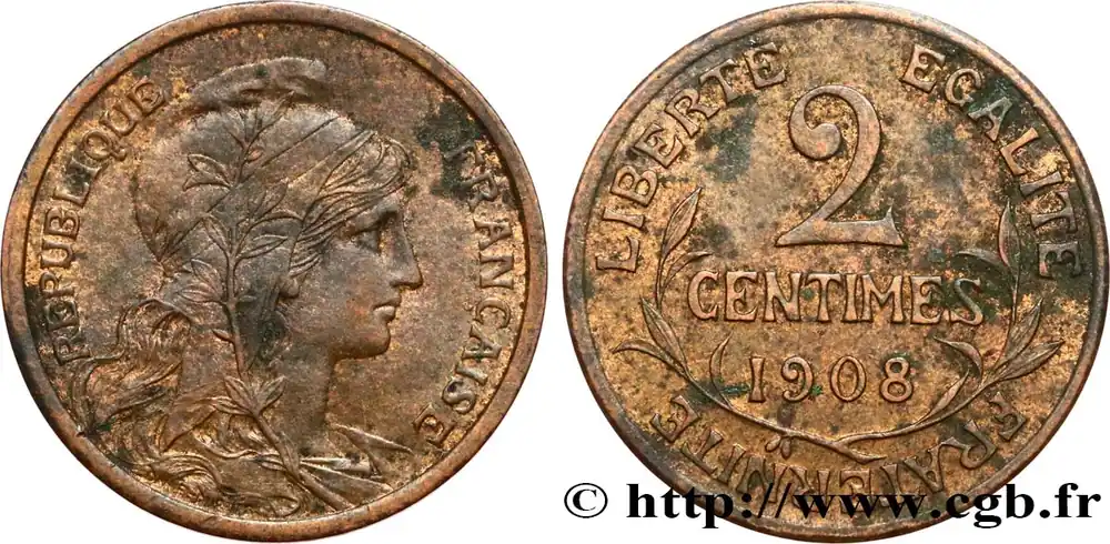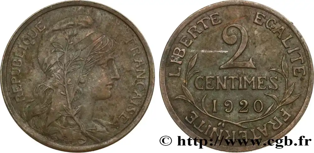 Type : 2 centimes Daniel-DupuisDate : 1907Nom de l’atelier/ville : ParisQuantité frappée : 250000Métal : bronzeDiamètre : 20 mmAxe des coins : 6 h.Poids : 1,99 g.Tranche : lisse Degré de rareté : R1Référence ouvrage :Classement FRANC 2023 / FRANC 2023 classificationF.110/10AversTitulature avers : REPUBLIQUE – FRANÇAISE.Description avers : Buste de la Liberté à droite, coiffée du bonnet phrygien orné d’une couronne ; signé au-dessous en creux DANIEL-DUPUIS.ReversTitulature revers : LIBERTE EGALITE – FRATERNITE.Description revers : 2 / CENTIMES / (millésime) entouré d’une branche d’olivier.HistoriqueTROISIÈME RÉPUBLIQUE(4/09/1870-10/07/1940) La nouvelle de la capitulation de Sedan provoque la révolution du 4 septembre 1870 à Paris. Proclamée à l’Hôtel de Ville, la République est dotée d’un gouvernement provisoire appelé gouvernement de la Défense nationale. Menacé à gauche par l’insurrection de la Commune et à droite par les monarchistes, le nouveau régime connaît des débuts difficiles. Chef du pouvoir exécutif dans un premier temps (février 1871), Thiers est chargé de réorganiser le pays avant de choisir sa forme de gouvernement. Il devient président de la République en août 1871 et, malgré son action de libération du territoire, doit quitter son poste en mars 1873 face à l’opposition royaliste. Il est alors remplacé par Mac-Mahon favorable au rétablissement de la monarchie mais celle-ci n’est pas restaurée à la suite de la question du drapeau. La loi du septennat est alors mise en place en novembre 1873 puis, en 1875, sont votées les lois fondamentales qui servent de Constitution à la Troisième République. Régime parlementaire, elle se caractérise notamment par la nette prépondérance du pouvoir législatif sur le pouvoir exécutif. Anticléricale, la Troisième République rend l’école gratuite, laïque et obligatoire mais continue la politique coloniale pour ses ambitions économiques, stratégiques et morales. La séparation des Églises et de l’État est votée en 1905. L’idée d’une revanche sur l’Allemagne et un nationalisme important sont au cœur de la crise boulangiste, du scandale de Panama ou de l’affaire Dreyfus des années 1886-1899 tandis que la politique étrangère est très active notamment au Maroc et que la course aux armements se développe. La Première Guerre mondiale coûte cher à la France qui ne se relève qu’à partir de 1920 voire 1928 pour la monnaie avec le franc « Poincaré ». La crise de 1929 ne se fait sentir qu’à partir de 1932 mais dure jusqu’en 1939, période durant laquelle l’instabilité ministérielle est très importante. Vacillant en 1934, la Troisième République trouve un nouveau ciment unitaire avec l’antifascisme qui permet l’arrivée au pouvoir du Front populaire en 1936. Mais, paralysée face à l’Allemagne, la France va alors s’enliser dans une « drôle de guerre » puis connaître l’une des plus grandes défaites de son histoire en juin 1940. Réunies en Assemblée nationale à Vichy le 10 juillet 1940, les Chambres, pourtant élues en 1936, votent les pleins pouvoirs à Pétain dans une sorte de suicide collectif par 569 voix pour, 80 voix contre et 18 abstentions.