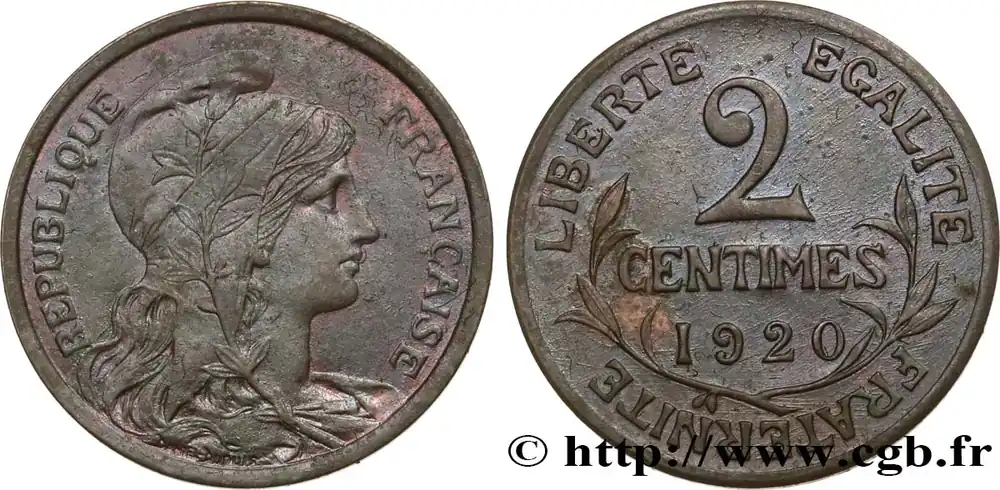 Type : 2 centimes Daniel-DupuisDate : 1910Nom de l’atelier/ville : ParisQuantité frappée : 1750000Métal : bronzeDiamètre : 20 mmAxe des coins : 6 h.Poids : 1,99 g.Tranche : lisse Référence ouvrage :Classement FRANC 2023 / FRANC 2023 classificationF.110/13AversTitulature avers : REPUBLIQUE – FRANÇAISE.Description avers : Buste de la Liberté à droite, coiffée du bonnet phrygien orné d’une couronne ; signé au-dessous en creux DANIEL-DUPUIS.ReversTitulature revers : LIBERTE EGALITE – FRATERNITE.Description revers : 2 / CENTIMES / (millésime) entouré d’une branche d’olivier.HistoriqueTROISIÈME RÉPUBLIQUE(4/09/1870-10/07/1940) La nouvelle de la capitulation de Sedan provoque la révolution du 4 septembre 1870 à Paris. Proclamée à l’Hôtel de Ville, la République est dotée d’un gouvernement provisoire appelé gouvernement de la Défense nationale. Menacé à gauche par l’insurrection de la Commune et à droite par les monarchistes, le nouveau régime connaît des débuts difficiles. Chef du pouvoir exécutif dans un premier temps (février 1871), Thiers est chargé de réorganiser le pays avant de choisir sa forme de gouvernement. Il devient président de la République en août 1871 et, malgré son action de libération du territoire, doit quitter son poste en mars 1873 face à l’opposition royaliste. Il est alors remplacé par Mac-Mahon favorable au rétablissement de la monarchie mais celle-ci n’est pas restaurée à la suite de la question du drapeau. La loi du septennat est alors mise en place en novembre 1873 puis, en 1875, sont votées les lois fondamentales qui servent de Constitution à la Troisième République. Régime parlementaire, elle se caractérise notamment par la nette prépondérance du pouvoir législatif sur le pouvoir exécutif. Anticléricale, la Troisième République rend l’école gratuite, laïque et obligatoire mais continue la politique coloniale pour ses ambitions économiques, stratégiques et morales. La séparation des Églises et de l’État est votée en 1905. L’idée d’une revanche sur l’Allemagne et un nationalisme important sont au cœur de la crise boulangiste, du scandale de Panama ou de l’affaire Dreyfus des années 1886-1899 tandis que la politique étrangère est très active notamment au Maroc et que la course aux armements se développe. La Première Guerre mondiale coûte cher à la France qui ne se relève qu’à partir de 1920 voire 1928 pour la monnaie avec le franc « Poincaré ». La crise de 1929 ne se fait sentir qu’à partir de 1932 mais dure jusqu’en 1939, période durant laquelle l’instabilité ministérielle est très importante. Vacillant en 1934, la Troisième République trouve un nouveau ciment unitaire avec l’antifascisme qui permet l’arrivée au pouvoir du Front populaire en 1936. Mais, paralysée face à l’Allemagne, la France va alors s’enliser dans une « drôle de guerre » puis connaître l’une des plus grandes défaites de son histoire en juin 1940. Réunies en Assemblée nationale à Vichy le 10 juillet 1940, les Chambres, pourtant élues en 1936, votent les pleins pouvoirs à Pétain dans une sorte de suicide collectif par 569 voix pour, 80 voix contre et 18 abstentions.