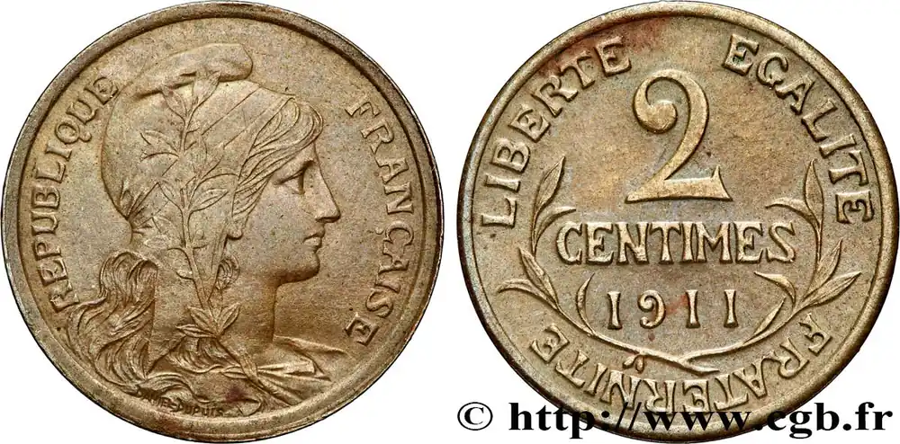 Type : 2 centimes Daniel-DupuisDate : 1910Nom de l’atelier/ville : ParisQuantité frappée : 1750000Métal : bronzeDiamètre : 20 mmAxe des coins : 6 h.Poids : 1,99 g.Tranche : lisse Référence ouvrage :Classement FRANC 2023 / FRANC 2023 classificationF.110/13AversTitulature avers : REPUBLIQUE – FRANÇAISE.Description avers : Buste de la Liberté à droite, coiffée du bonnet phrygien orné d’une couronne ; signé au-dessous en creux DANIEL-DUPUIS.ReversTitulature revers : LIBERTE EGALITE – FRATERNITE.Description revers : 2 / CENTIMES / (millésime) entouré d’une branche d’olivier.HistoriqueTROISIÈME RÉPUBLIQUE(4/09/1870-10/07/1940) La nouvelle de la capitulation de Sedan provoque la révolution du 4 septembre 1870 à Paris. Proclamée à l’Hôtel de Ville, la République est dotée d’un gouvernement provisoire appelé gouvernement de la Défense nationale. Menacé à gauche par l’insurrection de la Commune et à droite par les monarchistes, le nouveau régime connaît des débuts difficiles. Chef du pouvoir exécutif dans un premier temps (février 1871), Thiers est chargé de réorganiser le pays avant de choisir sa forme de gouvernement. Il devient président de la République en août 1871 et, malgré son action de libération du territoire, doit quitter son poste en mars 1873 face à l’opposition royaliste. Il est alors remplacé par Mac-Mahon favorable au rétablissement de la monarchie mais celle-ci n’est pas restaurée à la suite de la question du drapeau. La loi du septennat est alors mise en place en novembre 1873 puis, en 1875, sont votées les lois fondamentales qui servent de Constitution à la Troisième République. Régime parlementaire, elle se caractérise notamment par la nette prépondérance du pouvoir législatif sur le pouvoir exécutif. Anticléricale, la Troisième République rend l’école gratuite, laïque et obligatoire mais continue la politique coloniale pour ses ambitions économiques, stratégiques et morales. La séparation des Églises et de l’État est votée en 1905. L’idée d’une revanche sur l’Allemagne et un nationalisme important sont au cœur de la crise boulangiste, du scandale de Panama ou de l’affaire Dreyfus des années 1886-1899 tandis que la politique étrangère est très active notamment au Maroc et que la course aux armements se développe. La Première Guerre mondiale coûte cher à la France qui ne se relève qu’à partir de 1920 voire 1928 pour la monnaie avec le franc « Poincaré ». La crise de 1929 ne se fait sentir qu’à partir de 1932 mais dure jusqu’en 1939, période durant laquelle l’instabilité ministérielle est très importante. Vacillant en 1934, la Troisième République trouve un nouveau ciment unitaire avec l’antifascisme qui permet l’arrivée au pouvoir du Front populaire en 1936. Mais, paralysée face à l’Allemagne, la France va alors s’enliser dans une « drôle de guerre » puis connaître l’une des plus grandes défaites de son histoire en juin 1940. Réunies en Assemblée nationale à Vichy le 10 juillet 1940, les Chambres, pourtant élues en 1936, votent les pleins pouvoirs à Pétain dans une sorte de suicide collectif par 569 voix pour, 80 voix contre et 18 abstentions.