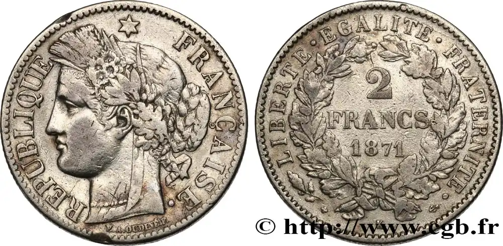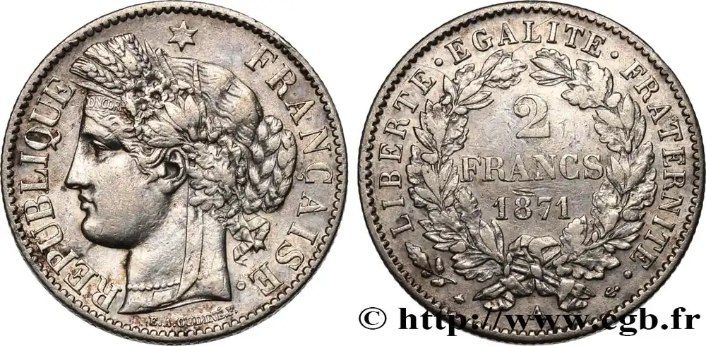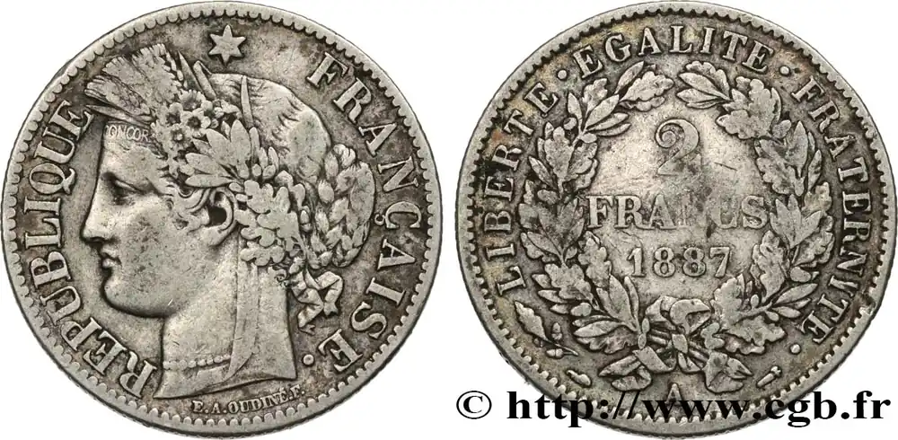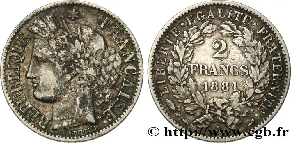 Type : 2 francs Cérès, avec légendeDate : 1895Nom de l’atelier/ville : ParisQuantité frappée : 600.000Métal : argentTitre en millième : 835 ‰Diamètre : 27 mmAxe des coins : 6 h.Poids : 10 g.Tranche : canneléeSlabPCGS : MS65Commentaires sur l’état de conservation :Sous coque PCGS MS65Référence ouvrage :Classement FRANC 2023 / FRANC 2023 classificationF.265/17AversTitulature avers : REPUBLIQUE * FRANÇAISE..Description avers : tête de la République à gauche en Cérès, déesse des moissons, portant un collier de perles, un double chignon et une couronne composite de blé, fleurs, olivier et olives, chêne et glands, nouée par un ruban descendant sur le cou et passant sur le front où est inscrit le mot CONCOR ; sous la tranche du cou le long du listel E. A. OUDINÉ. F..ReversTitulature revers : (DIFFÉRENT) (BRANCHE DE CHÊNE) LIBERTE . EGALITE . FRATERNITE. (DIFFÉRENT).Description revers : 2 / FRANCS, en deux lignes dans le champ, au-dessus du millésime, dans une couronne composite de deux branches de chêne et de deux branches de laurier, nouées deux par deux en bas par un ruban ; sous le nœud, la lettre d’atelier.HistoriqueTROISIÈME RÉPUBLIQUE(4/09/1870-10/07/1940) La nouvelle de la capitulation de Sedan provoque la révolution du 4 septembre 1870 à Paris. Proclamée à l’Hôtel de Ville, la République est dotée d’un gouvernement provisoire appelé gouvernement de la Défense nationale. Menacé à gauche par l’insurrection de la Commune et à droite par les monarchistes, le nouveau régime connaît des débuts difficiles. Chef du pouvoir exécutif dans un premier temps (février 1871), Thiers est chargé de réorganiser le pays avant de choisir sa forme de gouvernement. Il devient président de la République en août 1871 et, malgré son action de libération du territoire, doit quitter son poste en mars 1873 face à l’opposition royaliste. Il est alors remplacé par Mac-Mahon favorable au rétablissement de la monarchie mais celle-ci n’est pas restaurée à la suite de la question du drapeau. La loi du septennat est alors mise en place en novembre 1873 puis, en 1875, sont votées les lois fondamentales qui servent de Constitution à la Troisième République. Régime parlementaire, elle se caractérise notamment par la nette prépondérance du pouvoir législatif sur le pouvoir exécutif. Anticléricale, la Troisième République rend l’école gratuite, laïque et obligatoire mais continue la politique coloniale pour ses ambitions économiques, stratégiques et morales. La séparation des Églises et de l’État est votée en 1905. L’idée d’une revanche sur l’Allemagne et un nationalisme important sont au cœur de la crise boulangiste, du scandale de Panama ou de l’affaire Dreyfus des années 1886-1899 tandis que la politique étrangère est très active notamment au Maroc et que la course aux armements se développe. La Première Guerre mondiale coûte cher à la France qui ne se relève qu’à partir de 1920 voire 1928 pour la monnaie avec le franc « Poincaré ». La crise de 1929 ne se fait sentir qu’à partir de 1932 mais dure jusqu’en 1939, période durant laquelle l’instabilité ministérielle est très importante. Vacillant en 1934, la Troisième République trouve un nouveau ciment unitaire avec l’antifascisme qui permet l’arrivée au pouvoir du Front populaire en 1936. Mais, paralysée face à l’Allemagne, la France va alors s’enliser dans une « drôle de guerre » puis connaître l’une des plus grandes défaites de son histoire en juin 1940. Réunies en Assemblée nationale à Vichy le 10 juillet 1940, les Chambres, pourtant élues en 1936, votent les pleins pouvoirs à Pétain dans une sorte de suicide collectif par 569 voix pour, 80 voix contre et 18 abstentions.