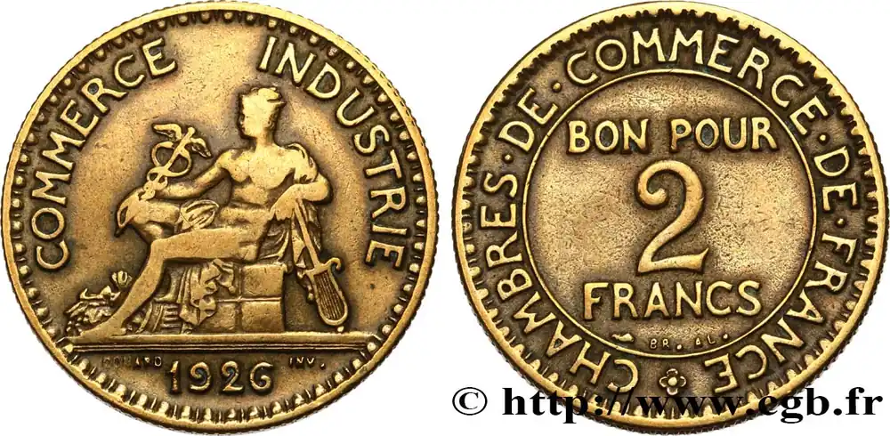 Type : 2 francs Chambres de CommerceDate : 1927Quantité frappée : 1678263Métal : bronze-aluminiumDiamètre : 27,06 mmAxe des coins : 6 h.Poids : 8,10 g.Tranche : canneléeDegré de rareté : R1Commentaires sur l’état de conservation :Gros coup sur la tranche à 1h30 au droitRéférence ouvrage :Classement FRANC 2023 / FRANC 2023 classificationF.267/9AversTitulature avers : COMMERCE INDUSTRIE.Description avers : Mercure assis à gauche sur un ballot de marchandise, légèrement drapé et coiffé du pétase ailé, la main gauche appuyée sur un gouvernail antique, la main droite tenant un caducée ; une corne d’abondance en arrière-plan du ballot ; sous un trait d’exergue, 1927 accosté de DOMARDINV..ReversTitulature revers : (ROSETTE) CHAMBRES. DE. COMMERCE. DE. FRANCE.Description revers : BON POUR / 2 / FRANCS, en trois lignes dans le champ ; au-dessous corne de la Régie des Monnaies à droite BR. AL..HistoriqueTROISIÈME RÉPUBLIQUE(4/09/1870-10/07/1940) La nouvelle de la capitulation de Sedan provoque la révolution du 4 septembre 1870 à Paris. Proclamée à l’Hôtel de Ville, la République est dotée d’un gouvernement provisoire appelé gouvernement de la Défense nationale. Menacé à gauche par l’insurrection de la Commune et à droite par les monarchistes, le nouveau régime connaît des débuts difficiles. Chef du pouvoir exécutif dans un premier temps (février 1871), Thiers est chargé de réorganiser le pays avant de choisir sa forme de gouvernement. Il devient président de la République en août 1871 et, malgré son action de libération du territoire, doit quitter son poste en mars 1873 face à l’opposition royaliste. Il est alors remplacé par Mac-Mahon favorable au rétablissement de la monarchie mais celle-ci n’est pas restaurée à la suite de la question du drapeau. La loi du septennat est alors mise en place en novembre 1873 puis, en 1875, sont votées les lois fondamentales qui servent de Constitution à la Troisième République. Régime parlementaire, elle se caractérise notamment par la nette prépondérance du pouvoir législatif sur le pouvoir exécutif. Anticléricale, la Troisième République rend l’école gratuite, laïque et obligatoire mais continue la politique coloniale pour ses ambitions économiques, stratégiques et morales. La séparation des Églises et de l’État est votée en 1905. L’idée d’une revanche sur l’Allemagne et un nationalisme important sont au cœur de la crise boulangiste, du scandale de Panama ou de l’affaire Dreyfus des années 1886-1899 tandis que la politique étrangère est très active notamment au Maroc et que la course aux armements se développe. La Première Guerre mondiale coûte cher à la France qui ne se relève qu’à partir de 1920 voire 1928 pour la monnaie avec le franc « Poincaré ». La crise de 1929 ne se fait sentir qu’à partir de 1932 mais dure jusqu’en 1939, période durant laquelle l’instabilité ministérielle est très importante. Vacillant en 1934, la Troisième République trouve un nouveau ciment unitaire avec l’antifascisme qui permet l’arrivée au pouvoir du Front populaire en 1936. Mais, paralysée face à l’Allemagne, la France va alors s’enliser dans une « drôle de guerre » puis connaître l’une des plus grandes défaites de son histoire en juin 1940. Réunies en Assemblée nationale à Vichy le 10 juillet 1940, les Chambres, pourtant élues en 1936, votent les pleins pouvoirs à Pétain dans une sorte de suicide collectif par 569 voix pour, 80 voix contre et 18 abstentions.