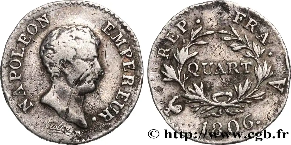 Type : 2 francs Napoléon Ier tête laurée, Empire françaisDate : 1811Nom de l’atelier/ville : ParisQuantité frappée : 2508686Métal : argentTitre en millième : 900 ‰Diamètre : 27 mmAxe des coins : 6 h.Poids : 9,74 g.Tranche : en creux : * DIEU PROTEGE LA FRANCERéférence ouvrage :Classement FRANC 2023 / FRANC 2023 classificationF.255/24AversTitulature avers : NAPOLEON EMPEREUR (PETIT LOSANGE).Description avers : Tête laurée de Napoléon Ier à droite, un ruban descendant le long du cou ; au-dessous Tiolier en cursif.ReversTitulature revers : EMPIRE FRANÇAIS (PETIT LOSANGE) / (DIFFÉRENT) 1811 (PETIT LOSANGE) A.Description revers : 2 / FRANCS (petit losange), en deux lignes, dans une couronne composée de deux branches de laurier, nouées à leur base par un ruban.HistoriquePREMIER EMPIRE(18/05/1804-6/04/1814) Renforcée par la conspiration de Cadoudal de mars 1804, l’idée du pouvoir héréditaire trouve son aboutissement le 18 mai 1804 lorsque Napoléon Bonaparte devient empereur des Français sous le nom de Napoléon Ier. Ratifié par plébiscite, l’Empire est consacré le 2 décembre 1804 lors du sacre de Notre-Dame. La Constitution de l’an XII étant toujours en vigueur, le Premier Empire semble fonctionner comme une continuation de la République française dirigée par un empereur. C’est en réalité une dictature personnelle où l’empereur nomme et révoque les ministres, a l’initiative des lois et contrôle le Corps législatif. Dans les départements, les préfets renseignent le ministère de l’Intérieur. Les postes, la presse, l’imprimerie sont contrôlées par la censure. Les grands corps de l’Etat sont réorganisés ainsi que la Justice avec le Code pénal qui complète le Code civil achevé sous le Consulat. Universités et écoles sont encadrées. En 1805, Napoléon devient roi d’Italie tandis que se forment des coalitions contre l’Empire. Malgré la défaite navale de Trafalgar, les armées impériales remportent de nombreuses victoires terrestres comme Austerlitz, Iéna ou Eylau qui assurent le contrôle de l’Europe continentale. Démembrée, celle-ci est attribuée à la famille Bonaparte qui semble triompher partout. Fortifiée par le blocus continental, l’industrie est prospère mais le commerce souffre. En 1808, le blocus continental est renforcé par un second décret pris à Milan en date du 17 décembre 1807. La guerre d’Espagne débute après que Junot ait conquis le Portugal qui refusait d’appliquer le blocus. Rapidement, les Madrilènes se soulèvent contre l’occupation française de Murat. Les 1er et 2 mai, les français répriment avec férocité des mouvements de guérilla. Des exécutions massives ont lieu. Elles sont immortalisées par Goya dans son célèbre Primer y Dos de Mayo. Joseph, roi de Naples, est nommé roi d’Espagne à contrecœur. Murat le remplace sur le trône de Naples avec sa femme Caroline. Malgré les abdications forcées de Charles IV et de Ferdinand VII à Bayonne, en présence de Napoléon, les Français assistent à un soulèvement général en Espagne et sont battus à Bailen le 22 juillet : ils perdent Madrid. Wellington et un corps expéditionnaire anglais débarquent au Portugal le 1er août. Junot doit capituler à Cintra le 30 août. Les Français reprennent Madrid le 4 décembre 1808. En avril 1809, Pie VII excommunie Napoléon qui le fait séquestrer en représailles. Les alliés forment la cinquième coalition, mais les Autrichiens sont battus à Eckmühl le 12 avril, Essling le 21 mai et Wagram le 6 juillet 1809. Au traité de Vienne, l’Autriche cède la Carniole, la Carinthie et la Croatie qui vont former les provinces illyriennes qui sont incorporées à l’Empire. La colonne Vendôme est inaugurée en 1810. Cette année là, Napoléon est au faîte de sa puissance et la France compte 130 départements du Tibre à l’Elbe. Après avoir divorcé d’avec Joséphine en décembre 1809, il épouse Marie-Louise d’Autriche le 2 avril 1810. Louis abdique du trône de Hollande, le 9 juillet 1810, refusant d’appliquer le Blocus Continental et le Royaume est annexé à la France. En 1811, l’Empereur, qui a fait dissoudre son mariage avec Joséphine, épouse l’archiduchesse Marie-Louise qui lui donne un fils, le roi de Rome qui naît aux Tuileries le 20 mars 1811. Les relations franco-russes se sont détériorées après le mariage autrichien. Finalement, Napoléon franchit le Niémen le 24 juin 1812. C’est le début de la campagne de Russie. À la tête de la Grande Armée, il prend Vilna (28 juin), remporte la victoire de Smolensk (18 août), puis la difficile bataille de la Moscova (5-7 septembre). Il prend Moscou entre le 15 et le 18 septembre. La ville est incendiée par les Russes et les Français doivent l’évacuer. La Grande Armée est obligée de faire retraite avec l’hiver russe qui commence très tôt et un ennemi qui pratique la politique de la terre brûlée. C’est la bataille de la Berezina le 27-29 novembre 1812. Sur 600.000 hommes, moins de 30.000 repassent la frontière russe. Le Général Malet tente un coup d’état à Paris le 23 octobre. Il est fusillé le 29. Les Russes occupent Varsovie, Hambourg et Dresde. Les Prussiens remportent les victoires de Lutzen et Bautzen les 2 et 21 mai 1813. Toute l’Europe se ligue contre Napoléon lors de la sixième coalition et il est battu à la bataille des Nations le 16-19 octobre 1813. La campagne de France commence en janvier 1814. Malgré les victoires de Montmirail et de Montereau les 10 et 18 février, Napoléon ne peut empêcher la capitulation de Paris le 31 mars. Il est contraint d’abdiquer le 6 avril 1814 et part sur l’île d’Elbe.