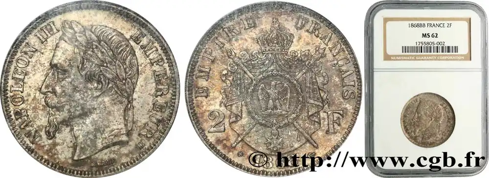 Type : 2 francs Napoléon Ier tête laurée, Empire françaisDate : 1814Nom de l’atelier/ville : ParisQuantité frappée : 94751Métal : argentTitre en millième : 900 ‰Diamètre : 27 mmAxe des coins : 6 h.Poids : 10,09 g.Tranche : en creux : * DIEU PROTEGE LA FRANCEDegré de rareté : R1Commentaires sur l’état de conservation :Fines stries d’ajustage sur le portraitRéférence ouvrage :Classement FRANC 2023 / FRANC 2023 classificationF.255/67AversTitulature avers : NAPOLEON EMPEREUR (PETIT LOSANGE).Description avers : Tête laurée de Napoléon Ier à droite, un ruban descendant le long du cou ; au-dessous Tiolier en cursif.ReversTitulature revers : EMPIRE FRANÇAIS (PETIT LOSANGE) / (DIFFÉRENT) 1814 (PETIT LOSANGE) A.Description revers : 2 / FRANCS (petit losange), en deux lignes, dans une couronne composée de deux branches de laurier, nouées à leur base par un ruban.HistoriquePREMIER EMPIRE(18/05/1804-6/04/1814) Renforcée par la conspiration de Cadoudal de mars 1804, l’idée du pouvoir héréditaire trouve son aboutissement le 18 mai 1804 lorsque Napoléon Bonaparte devient empereur des Français sous le nom de Napoléon Ier. Ratifié par plébiscite, l’Empire est consacré le 2 décembre 1804 lors du sacre de Notre-Dame. La Constitution de l’an XII étant toujours en vigueur, le Premier Empire semble fonctionner comme une continuation de la République française dirigée par un empereur. C’est en réalité une dictature personnelle où l’empereur nomme et révoque les ministres, a l’initiative des lois et contrôle le Corps législatif. Dans les départements, les préfets renseignent le ministère de l’Intérieur. Les postes, la presse, l’imprimerie sont contrôlées par la censure. Les grands corps de l’Etat sont réorganisés ainsi que la Justice avec le Code pénal qui complète le Code civil achevé sous le Consulat. Universités et écoles sont encadrées. En 1805, Napoléon devient roi d’Italie tandis que se forment des coalitions contre l’Empire. Malgré la défaite navale de Trafalgar, les armées impériales remportent de nombreuses victoires terrestres comme Austerlitz, Iéna ou Eylau qui assurent le contrôle de l’Europe continentale. Démembrée, celle-ci est attribuée à la famille Bonaparte qui semble triompher partout. Fortifiée par le blocus continental, l’industrie est prospère mais le commerce souffre. En 1808, le blocus continental est renforcé par un second décret pris à Milan en date du 17 décembre 1807. La guerre d’Espagne débute après que Junot ait conquis le Portugal qui refusait d’appliquer le blocus. Rapidement, les Madrilènes se soulèvent contre l’occupation française de Murat. Les 1er et 2 mai, les français répriment avec férocité des mouvements de guérilla. Des exécutions massives ont lieu. Elles sont immortalisées par Goya dans son célèbre Primer y Dos de Mayo. Joseph, roi de Naples, est nommé roi d’Espagne à contrecœur. Murat le remplace sur le trône de Naples avec sa femme Caroline. Malgré les abdications forcées de Charles IV et de Ferdinand VII à Bayonne, en présence de Napoléon, les Français assistent à un soulèvement général en Espagne et sont battus à Bailen le 22 juillet : ils perdent Madrid. Wellington et un corps expéditionnaire anglais débarquent au Portugal le 1er août. Junot doit capituler à Cintra le 30 août. Les Français reprennent Madrid le 4 décembre 1808. En avril 1809, Pie VII excommunie Napoléon qui le fait séquestrer en représailles. Les alliés forment la cinquième coalition, mais les Autrichiens sont battus à Eckmühl le 12 avril, Essling le 21 mai et Wagram le 6 juillet 1809. Au traité de Vienne, l’Autriche cède la Carniole, la Carinthie et la Croatie qui vont former les provinces illyriennes qui sont incorporées à l’Empire. La colonne Vendôme est inaugurée en 1810. Cette année là, Napoléon est au faîte de sa puissance et la France compte 130 départements du Tibre à l’Elbe. Après avoir divorcé d’avec Joséphine en décembre 1809, il épouse Marie-Louise d’Autriche le 2 avril 1810. Louis abdique du trône de Hollande, le 9 juillet 1810, refusant d’appliquer le Blocus Continental et le Royaume est annexé à la France. En 1811, l’Empereur, qui a fait dissoudre son mariage avec Joséphine, épouse l’archiduchesse Marie-Louise qui lui donne un fils, le roi de Rome qui naît aux Tuileries le 20 mars 1811. Les relations franco-russes se sont détériorées après le mariage autrichien. Finalement, Napoléon franchit le Niémen le 24 juin 1812. C’est le début de la campagne de Russie. À la tête de la Grande Armée, il prend Vilna (28 juin), remporte la victoire de Smolensk (18 août), puis la difficile bataille de la Moscova (5-7 septembre). Il prend Moscou entre le 15 et le 18 septembre. La ville est incendiée par les Russes et les Français doivent l’évacuer. La Grande Armée est obligée de faire retraite avec l’hiver russe qui commence très tôt et un ennemi qui pratique la politique de la terre brûlée. C’est la bataille de la Berezina le 27-29 novembre 1812. Sur 600.000 hommes, moins de 30.000 repassent la frontière russe. Le Général Malet tente un coup d’état à Paris le 23 octobre. Il est fusillé le 29. Les Russes occupent Varsovie, Hambourg et Dresde. Les Prussiens remportent les victoires de Lutzen et Bautzen les 2 et 21 mai 1813. Toute l’Europe se ligue contre Napoléon lors de la sixième coalition et il est battu à la bataille des Nations le 16-19 octobre 1813. La campagne de France commence en janvier 1814. Malgré les victoires de Montmirail et de Montereau les 10 et 18 février, Napoléon ne peut empêcher la capitulation de Paris le 31 mars. Il est contraint d’abdiquer le 6 avril 1814 et part sur l’île d’Elbe.