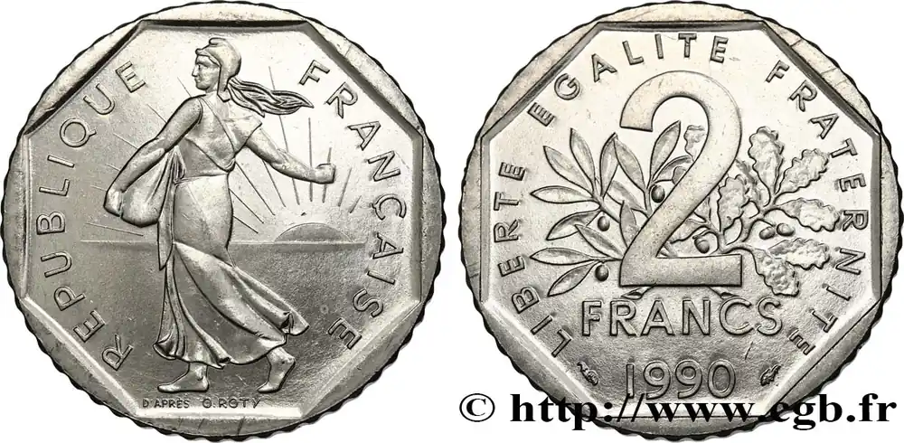 Type : 2 francs Semeuse, nickelDate : 1980Quantité frappée : 100010011Métal : nickelDiamètre : 26,5 mmAxe des coins : 6 h.Poids : 7,50 g.Tranche : canneléeRéférence ouvrage :Classement FRANC 2023 / FRANC 2023 classificationF.272/4AversTitulature avers : REPUBLIQUEFRANÇAISE..Description avers : La République à gauche, sous les traits d’une semeuse drapée et coiffée d’un bonnet phrygien, aux cheveux longs, marchant et semant à contre-vent ; en arrière-plan, derrière la semeuse à droite, un soleil levant ; au-dessous, D’APRÈS O. ROTY.ReversTitulature revers : LIBERTE EGALITE FRATERNITE..Description revers : 2 / FRANCS, brochant sur une branche d’olivier et une branche de chêne entrecroisées à leur base ; au-dessous 1980 encadré des différents.CommentaireExemplaire sous plastique issu d’une série Fleurs De Coins.HistoriqueCINQUIÈME RÉPUBLIQUE(depuis le 08/01/1959) La Cinquième République, dont la constitution a été approuvée par référendum le 28 septembre 1958 par plus de 79 % des Français, ne débute officiellement qu’avec l’installation du général de Gaulle comme président le 8 janvier 1959. La constitution est modifiée le 28 octobre 1962 par référendum où une majorité de 62 % des voix approuve l’élection du président de la République au suffrage universel direct. Les différents présidents de la Ve République sont Charles de Gaulle (8/01/1959 – 27/04/1969, retrait et Alain Poher devient président par intérim), Georges Pompidou (15/06/1969 – 2/04/1974, décédé, Alain Poher devient président par intérim), Valéry Giscard d’Estaing (19/05/1974 – 21/05/1981), François Mitterrand (21/05/1981 – 7/05/1995), Jacques Chirac (7/05/1995 – 16/05/2007) , Nicolas Sarkozy (16/05/2007 – 15/05/2012), François Hollande (15/05/2012 – 14/05/2017) et Emmanuel Macron (14/05/2017 – ).