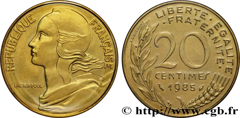Type : 20 centimes MarianneDate : 1982Nom de l’atelier/ville : PessacQuantité frappée : 150002511Métal : bronze-aluminiumDiamètre : 23,5 mmAxe des coins : 6 h.Poids : 4 g.Tranche : lisseRéférence ouvrage :Classement FRANC 2023 / FRANC 2023 classificationF.156/22AversTitulature avers : REPUBLIQUE FRANÇAISE.Description avers : Buste habillé de la République aux cheveux longs à gauche, les cheveux et les rubans du col au vent, coiffée d’un bonnet phrygien ; dans le champ, devant le cou dans le champ gauche LAGRIFFOUL.ReversTitulature revers : LIBERTE – EGALITE / – FRATERNITE -.Description revers : 20 / CENTIMES en deux lignes dans le champ, encadré des différents, au-dessus de 1982, le tout contenu dans une branche de laurier et un épi de blé ; à gauche de la branche de laurier, contre le listel, A. DIEUDONNE..CommentaireExemplaire sous plastique issu d’une série FDC .HistoriqueCINQUIÈME RÉPUBLIQUE(depuis le 08/01/1959) La Cinquième République, dont la constitution a été approuvée par référendum le 28 septembre 1958 par plus de 79 % des Français, ne débute officiellement qu’avec l’installation du général de Gaulle comme président le 8 janvier 1959. La constitution est modifiée le 28 octobre 1962 par référendum où une majorité de 62 % des voix approuve l’élection du président de la République au suffrage universel direct. Les différents présidents de la Ve République sont Charles de Gaulle (8/01/1959 – 27/04/1969, retrait et Alain Poher devient président par intérim), Georges Pompidou (15/06/1969 – 2/04/1974, décédé, Alain Poher devient président par intérim), Valéry Giscard d’Estaing (19/05/1974 – 21/05/1981), François Mitterrand (21/05/1981 – 7/05/1995), Jacques Chirac (7/05/1995 – 16/05/2007) , Nicolas Sarkozy (16/05/2007 – 15/05/2012), François Hollande (15/05/2012 – 14/05/2017) et Emmanuel Macron (14/05/2017 – ).