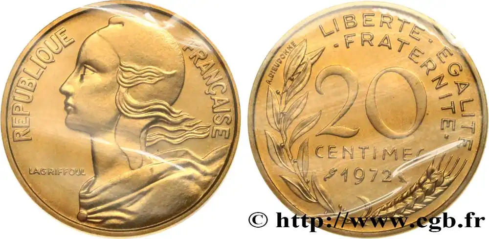 Type : 20 centimes MarianneDate : 1983Nom de l’atelier/ville : PessacQuantité frappée : 110000972Métal : bronze-aluminiumDiamètre : 23,5 mmAxe des coins : 6 h.Poids : 4 g.Tranche : lisseRéférence ouvrage :Classement FRANC 2023 / FRANC 2023 classificationF.156/23AversTitulature avers : REPUBLIQUE FRANÇAISE.Description avers : Buste habillé de la République aux cheveux longs à gauche, les cheveux et les rubans du col au vent, coiffée d’un bonnet phrygien ; dans le champ, devant le cou dans le champ gauche LAGRIFFOUL.ReversTitulature revers : LIBERTE – EGALITE / – FRATERNITE -.Description revers : 20 / CENTIMES en deux lignes dans le champ, encadré des différents, au-dessus de 1983, le tout contenu dans une branche de laurier et un épi de blé ; à gauche de la branche de laurier, contre le listel, A. DIEUDONNE..CommentaireExemplaire sous plastique et provenant d’une série FDC.HistoriqueCINQUIÈME RÉPUBLIQUE(depuis le 08/01/1959) La Cinquième République, dont la constitution a été approuvée par référendum le 28 septembre 1958 par plus de 79 % des Français, ne débute officiellement qu’avec l’installation du général de Gaulle comme président le 8 janvier 1959. La constitution est modifiée le 28 octobre 1962 par référendum où une majorité de 62 % des voix approuve l’élection du président de la République au suffrage universel direct. Les différents présidents de la Ve République sont Charles de Gaulle (8/01/1959 – 27/04/1969, retrait et Alain Poher devient président par intérim), Georges Pompidou (15/06/1969 – 2/04/1974, décédé, Alain Poher devient président par intérim), Valéry Giscard d’Estaing (19/05/1974 – 21/05/1981), François Mitterrand (21/05/1981 – 7/05/1995), Jacques Chirac (7/05/1995 – 16/05/2007) , Nicolas Sarkozy (16/05/2007 – 15/05/2012), François Hollande (15/05/2012 – 14/05/2017) et Emmanuel Macron (14/05/2017 – ).
