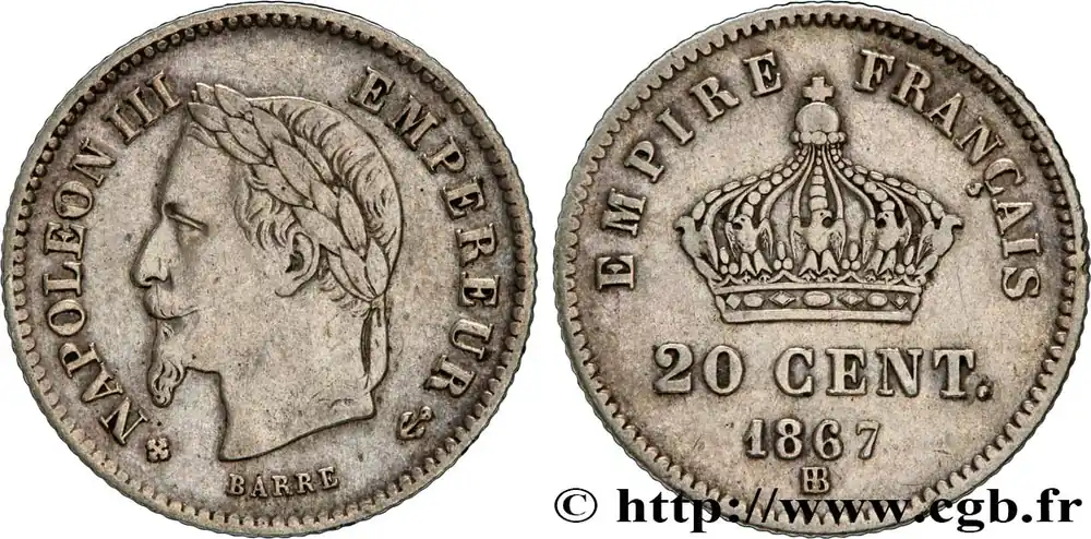 Type : 20 centimes Napoléon III, tête laurée, grand moduleDate : 1868Nom de l’atelier/ville : ParisQuantité frappée : 352510Métal : argentTitre en millième : 835 ‰Diamètre : 16 mmAxe des coins : 6 h.Poids : 0,97 g.Tranche : canneléeCommentaires sur l’état de conservation :Exemplaire nettoyéRéférence ouvrage :Classement FRANC 2023 / FRANC 2023 classificationF.150/4AversTitulature avers : NAPOLEON III – EMPEREUR.Description avers : Tête laurée de Napoléon III à gauche ; signé BARRE au-dessous.ReversTitulature revers : EMPIRE FRANCAIS // 20 CENT. // 1868 A.Description revers : Couronne impériale.HistoriqueSECOND EMPIRE(02/12/1852-04/09/1870) Proclamé empereur sous le nom de Napoléon III, Louis Napoléon fait son entrée solennelle à Paris le 2 décembre 1852. Il épouse Eugénie Marie de Montijo, aristocrate espagnole, en janvier 1853. Son règne peut se diviser en trois périodes : l’Empire autoritaire jusqu’en 1860 ; l’Empire libéral de 1860 à 1870 puis l’Empire parlementaire en 1870. Durant l’Empire autoritaire, Napoléon III exerce son pouvoir sans partage, contrôle la presse tandis que les journaux pratiquent l’autocensure pour éviter leur suppression. Les préfets exercent une puissance illimitée dans les départements, les maires, les fonctionnaires sont nommés par le gouvernement. Comme sous le Premier Empire, l’Éducation et l’Université sont surveillées. Maintenant les grands principes de la révolution, la souveraineté du peuple est continuée grâce à la consultation par plébiscite. Sur le plan économique, l’essor est important, l’industrialisation se développe ainsi que les organismes de crédit et les grands magasins. Le prestige militaire est accru par la guerre de Crimée qui permet à la France de jouer un rôle international. L’attentat d’Orsini (janvier 1858) n’empêche nullement la France d’intervenir en Italie pour faire triompher le principe des nationalités et permet le rattachement de Nice et de la Savoie par le traité de Turin (mars 1860). Dès 1860, l’Empire évolue vers plus de libertés : traité libre-échangiste de commerce avec l’Angleterre, apparition d’une faible opposition dans le Corps législatif, octroi du droit de grève (1864), libéralisation de la presse (1868). Sur le plan international, la France acquiert la Nouvelle-Calédonie, la Cochinchine et encourage le creusement du canal de Suez par Ferdinand de Lesseps. Au Mexique, le soutien à Maximilien et à l’Autriche est toutefois un échec. Les élections de 1869 sont très mauvaises pour le régime et l’opposition obtient 45 % des voix. Le régime évolue alors vers un Empire parlementaire en appelant Émile Ollivier, chef du parti orléaniste et libéral, au pouvoir. Après Sadowa en 1866 où la Prusse écrase l’Autriche, l’affaire du trône d’Espagne et de la dépêche d’Ems entraînent la guerre qui est déclarée le 19 juillet 1870. Accumulant les revers, l’armée française est encerclée dans Metz puis Napoléon III, malade, capitule à Sedan le 2 septembre. Aussitôt la nouvelle connue, la déchéance de l’Empire est annoncée par Gambetta puis la République est proclamée le 4 septembre. Napoléon III est alors emmené en captivité en Hesse puis part dans le Kent où il meurt en 1873.